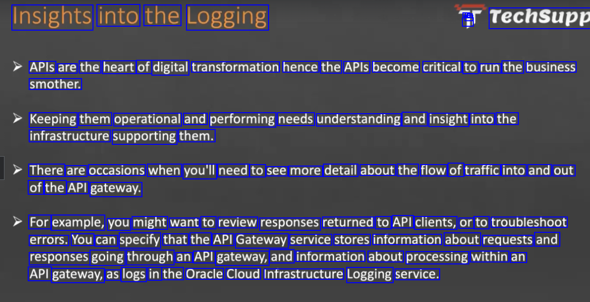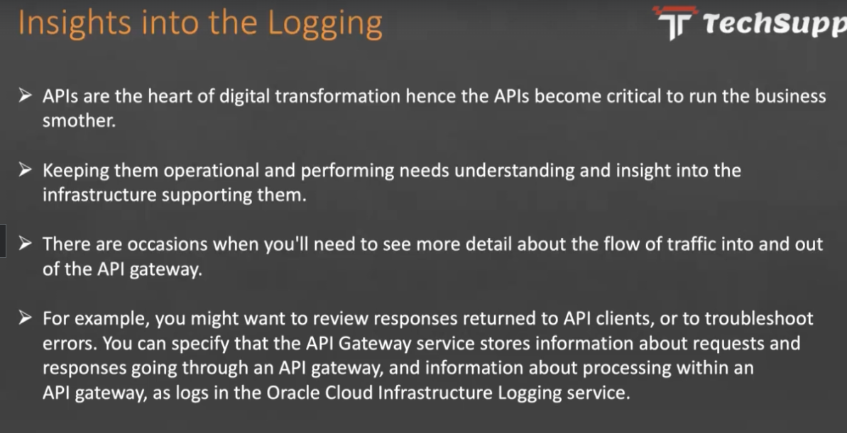 Insights into the Logging I - - I - Techsupp APIS are the heart of digital transformation hence the APIS become critical to run the business smother. Keeping them operational and performing needs understanding and insight into the infrastructure supporting them. There are occasions when you'll need to see more detail about the flow of traffic into and out of the API gateway. For example, you might want to review responses returned to API clients, or to troubleshoot errors. You can specify that the API Gateway service stores information about requests and responses going through an API gateway, and information about processing within an API gateway, as logs in the Oracle Cloud Infrastructure Logging service.