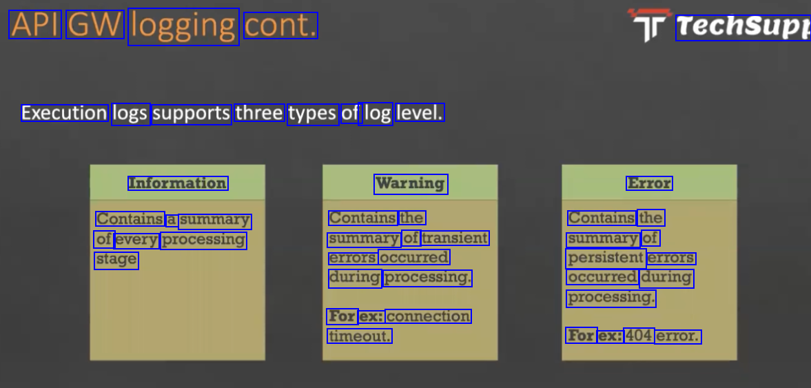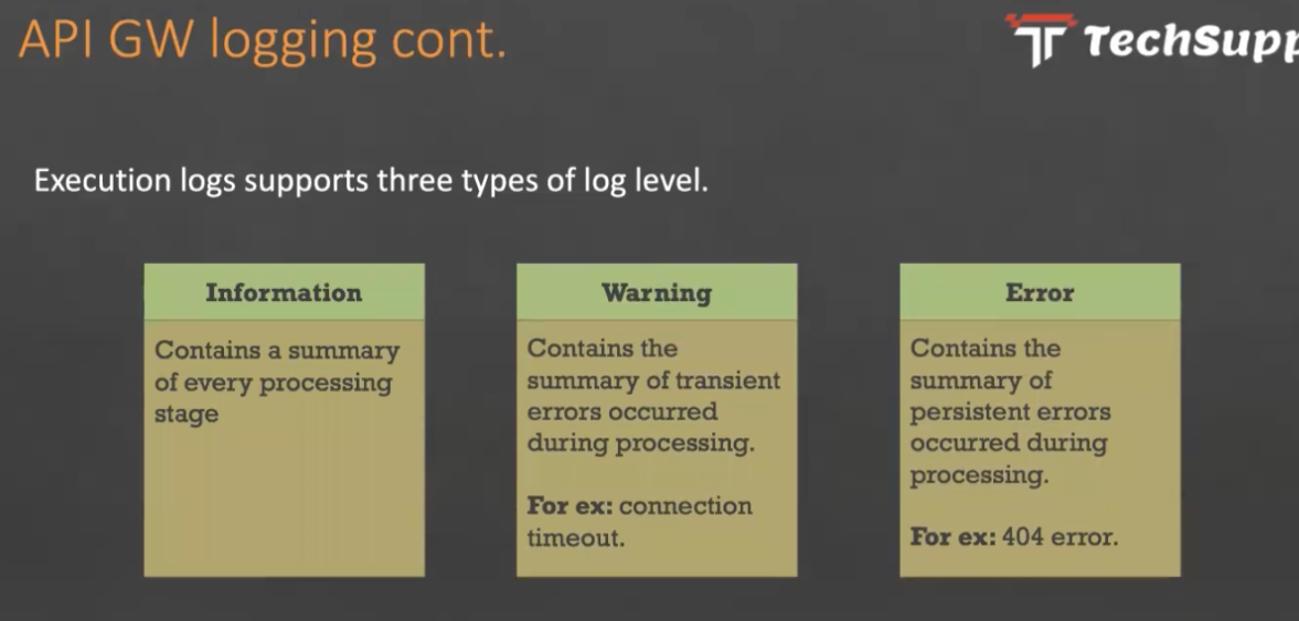 API GW logging cont. Techsupt Execution logs supports three types of log level. Information Warning Error Contains a summary of every processing Contains the Contains the summary of persistent errors occurred during processing. summary of transient errors occurred during processing. stage For ex: connection timeout. For ex: 404 error.