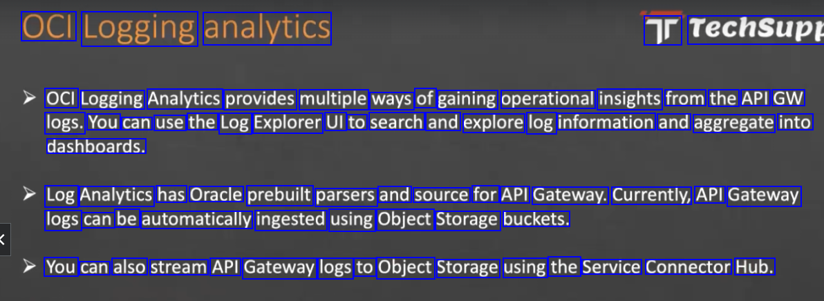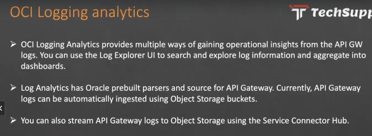 OCI Logging analytics Tr Techsupt OCI Logging Analytics provides multiple ways of gaining operational insights from the API GW logs. You can use the Log Explorer UI to search and explore log information and aggregate into dashboards. Log Analytics has Oracle prebuilt parsers and source for API Gateway. Currently, API Gateway logs can be automatically ingested using Object Storage buckets. You can also stream API Gateway logs to Object Storage using the Service Connector Hub.