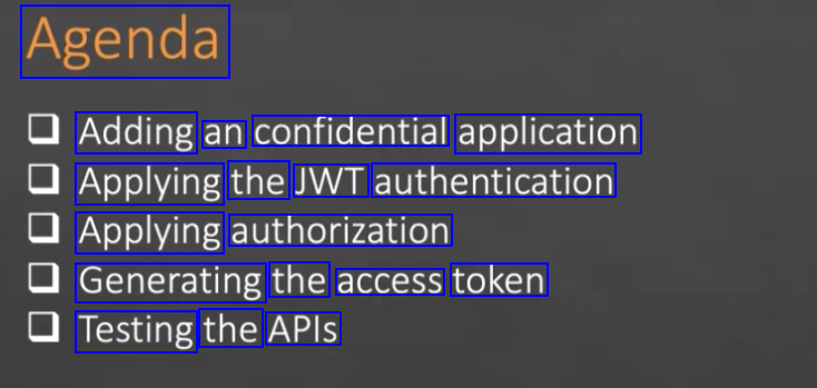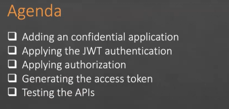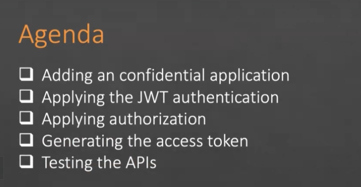 Agenda - Adding an confidential application Applying the JWT authentication Applying authorization Generating the access token Testing the APIs