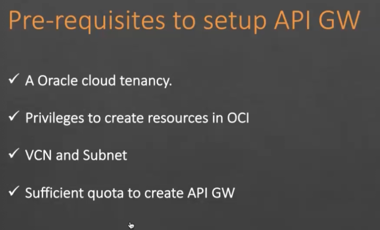 Pre-requisites to setup APIC GW I - A Oracle cloud tenancy. Privileges to create resources in OCI VCN and Subnet Sufficient quota to create API GW