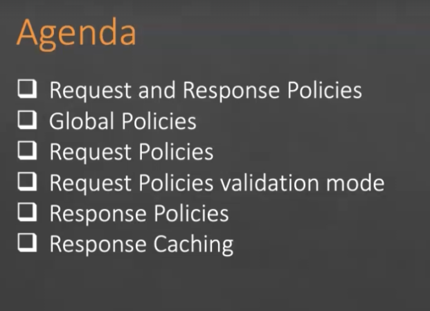 Agenda - Request and Response Policies Global Policies Request Policies Request Policies validation mode Response Policies Response Caching