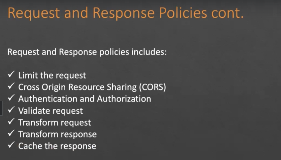 Request and Response Policies cont. Request and Response policies includes: Limit the request Cross Origin Resource Sharing (CORS) Authentication and Authorization Validate request Transform request Transform response Cache the response