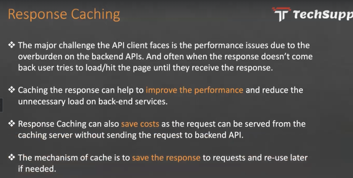 Response Caching Tr Techsupp % The major challenge the API client faces is the performance issues due to the overburden on the backend APIs. And often when the response doesn't come back user tries to load/hit the page until they receive the response. % Caching the response can help to improve the performance and reduce the unnecessary load on back-end services. Response Caching can also save costs as the request can be served from the caching server without sending the request to backend API. & The mechanism of cache is to save the response to requests and re-use later if needed.