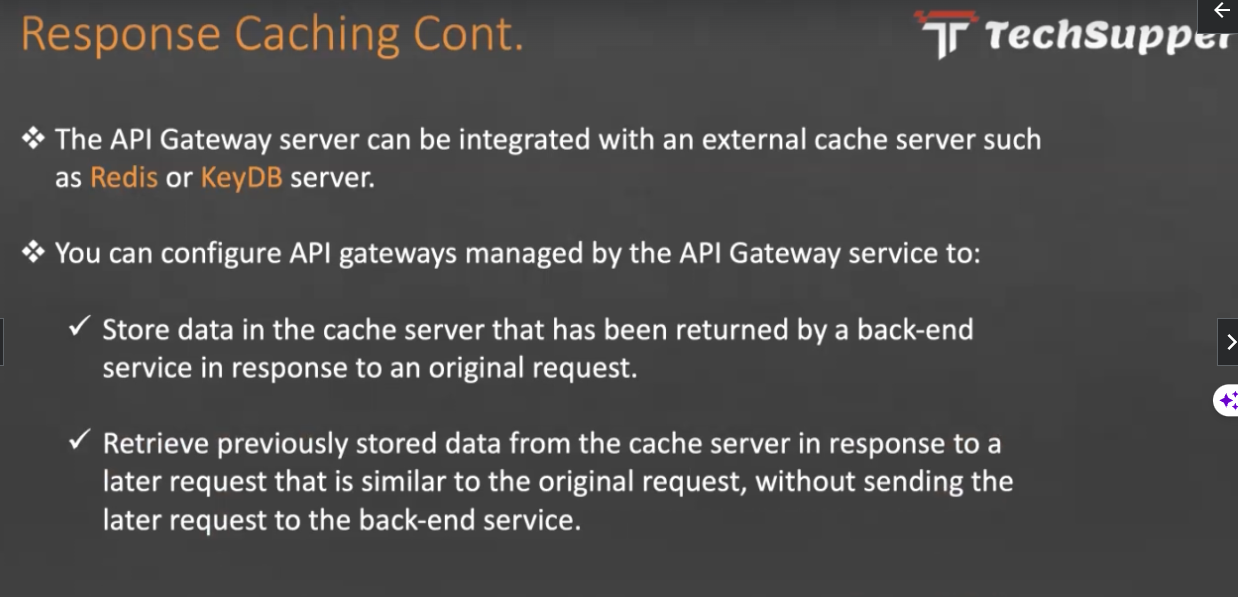 € Response Caching Cont. Tr Techsupper X The API Gateway server can be integrated with an external cache server such as Redis or KeyDB server. You can configure API gateways managed by the API Gateway service to: Store data in the cache server that has been returned by a back-end > service in response to an original request. Retrieve previously stored data from the cache server in response to a later request that is similar to the original request, without sending the later request to the back-end service.