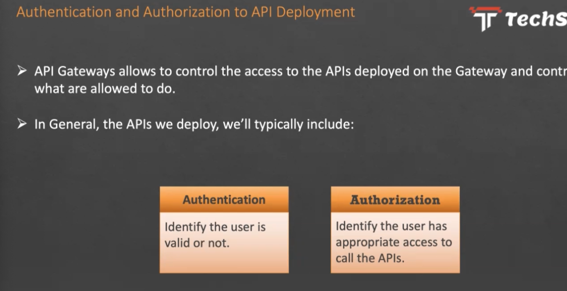 Authentication and Authorization to API Deployment I - - Techs API Gateways allows to control the access to the APIs deployed on the Gateway and contr what are allowed to do. In General, the APIS we deploy, we'll typically include: Authentication Authorization Identify the user is valid or not. Identify the user has appropriate access to call the APIs.