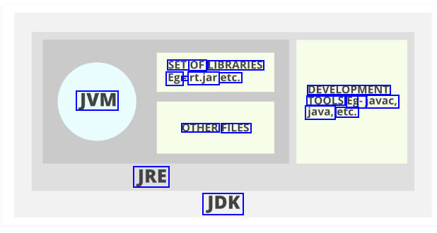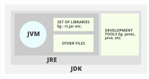 SET OF LIBRARIES Eg - rt.jar etc. DEVELOPMENT TOOLS Eg- -javac, java, etc. JVM OTHER FILES JRE JDK
