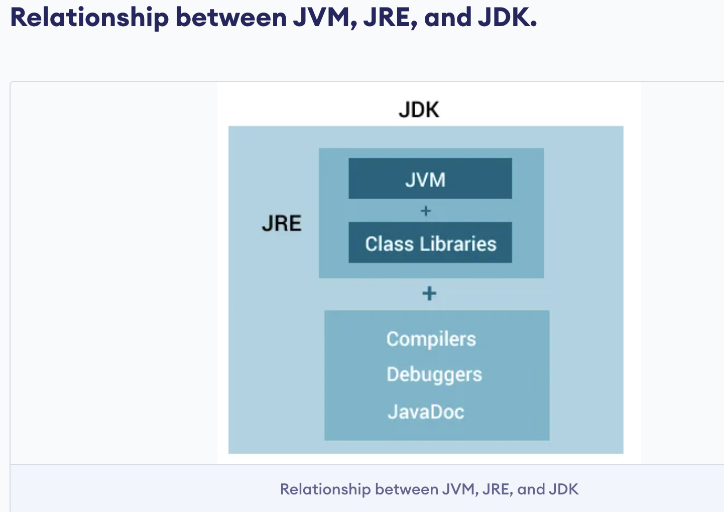 Relationship between. JVM, JRE, andJDK. JDK JVM - JRE Class Libraries Compilers Debuggers JavaDoc Relationship between JVM,JRE, and JDK
