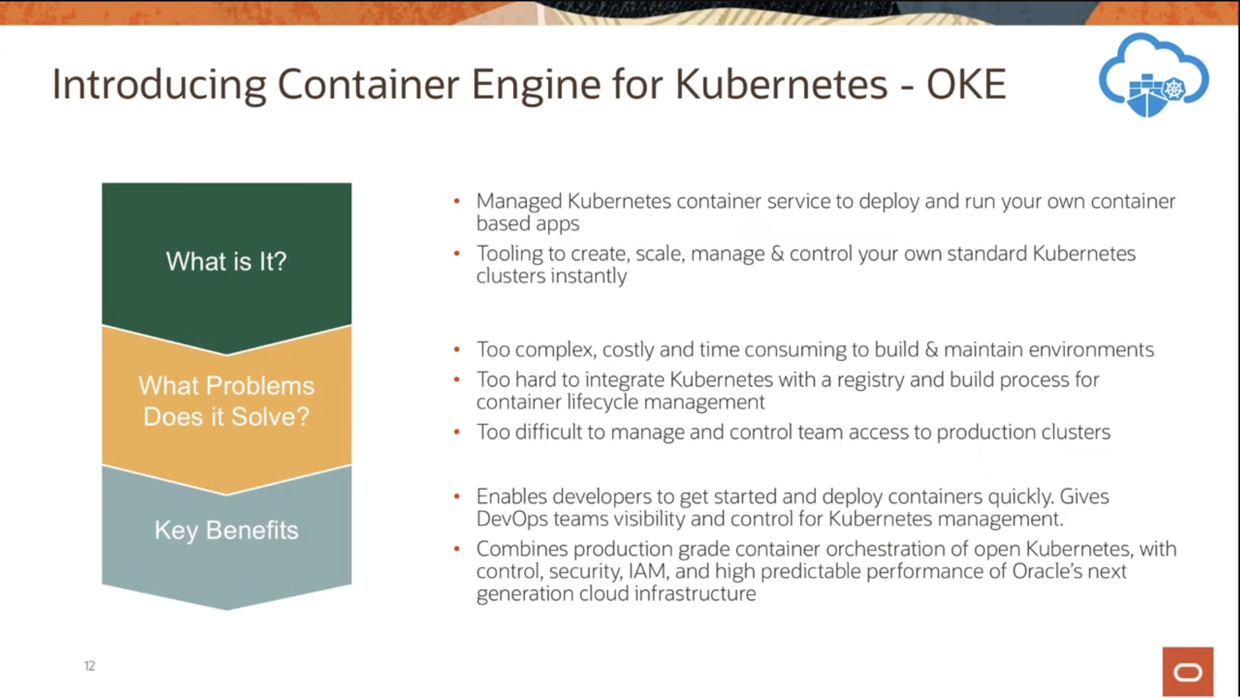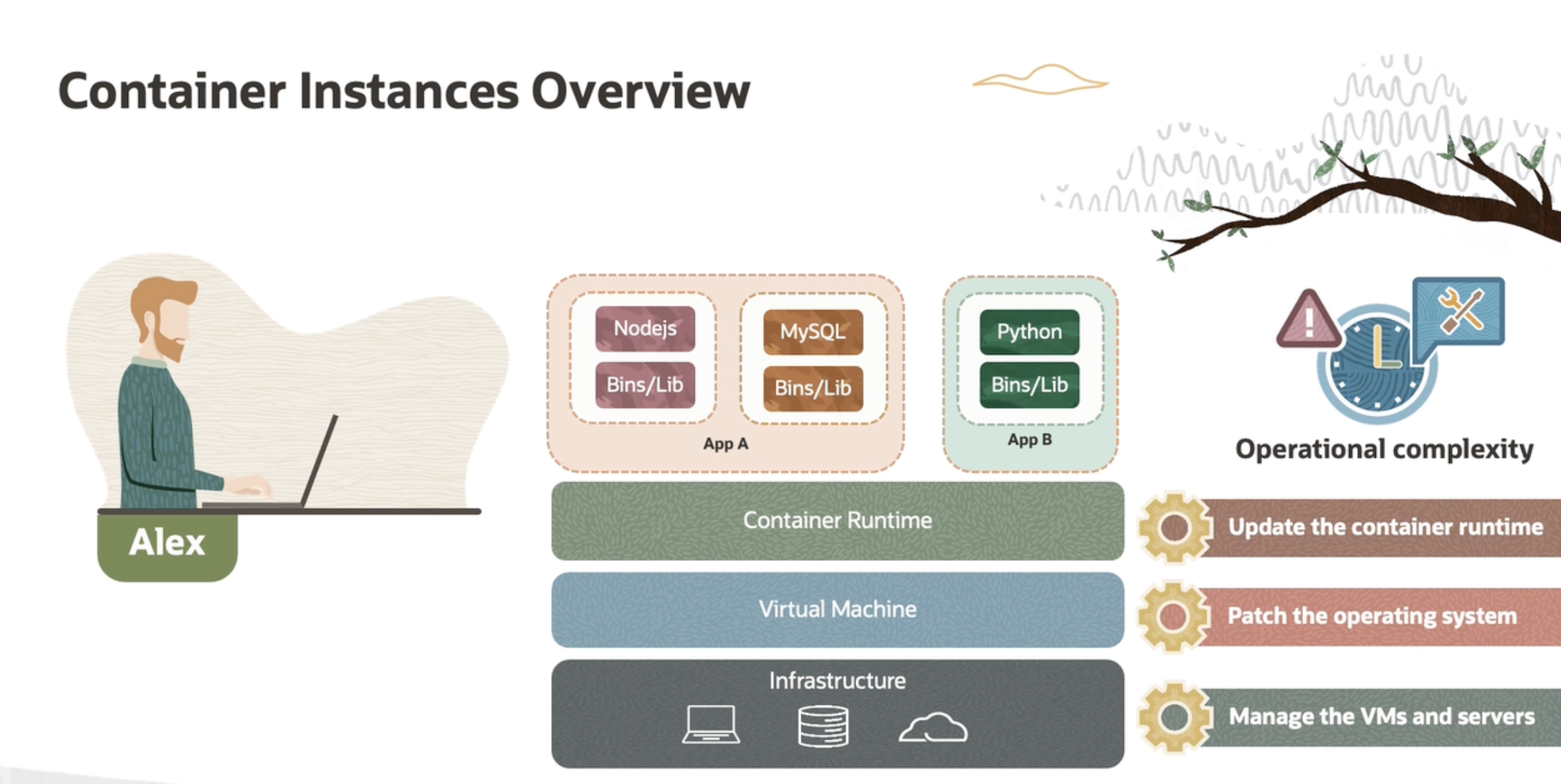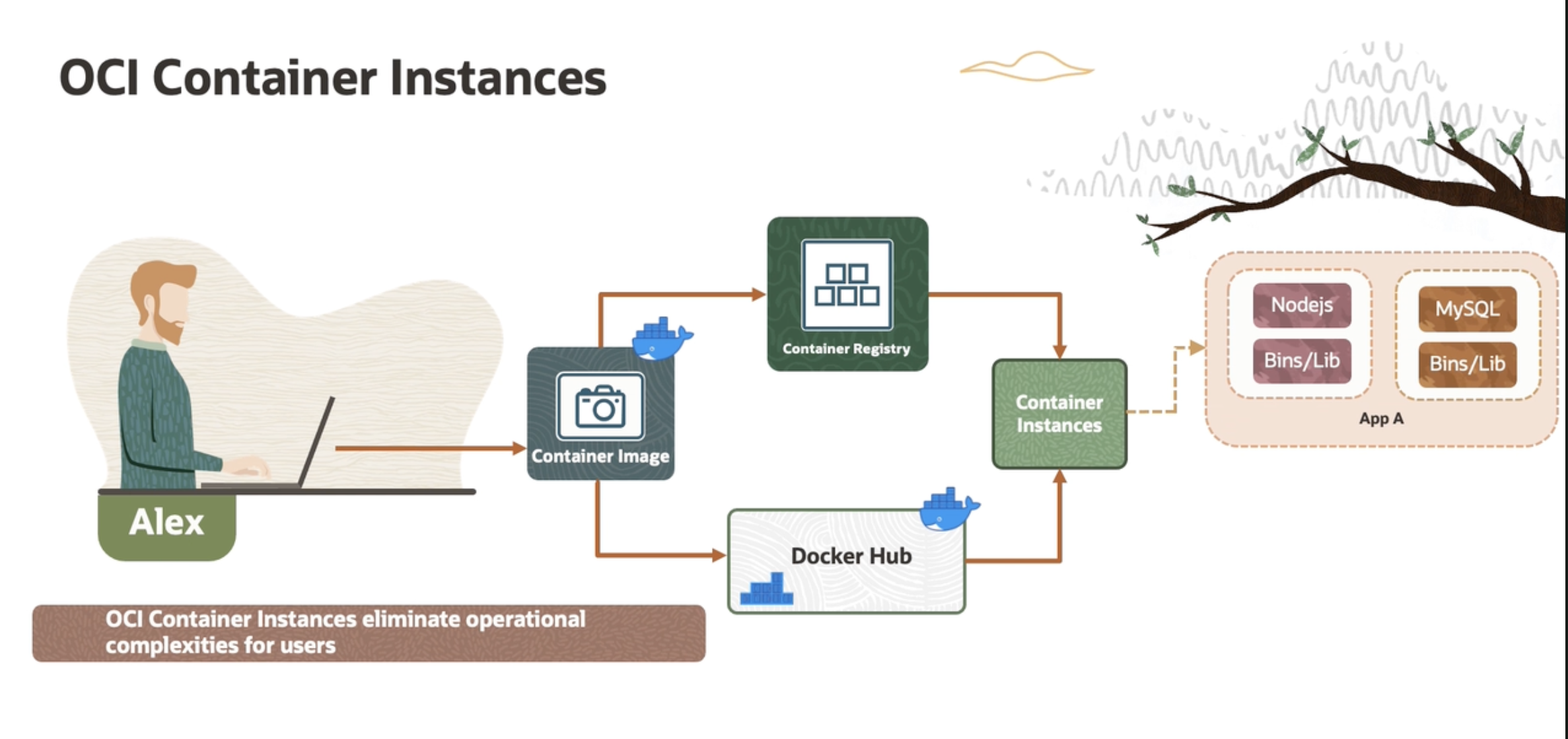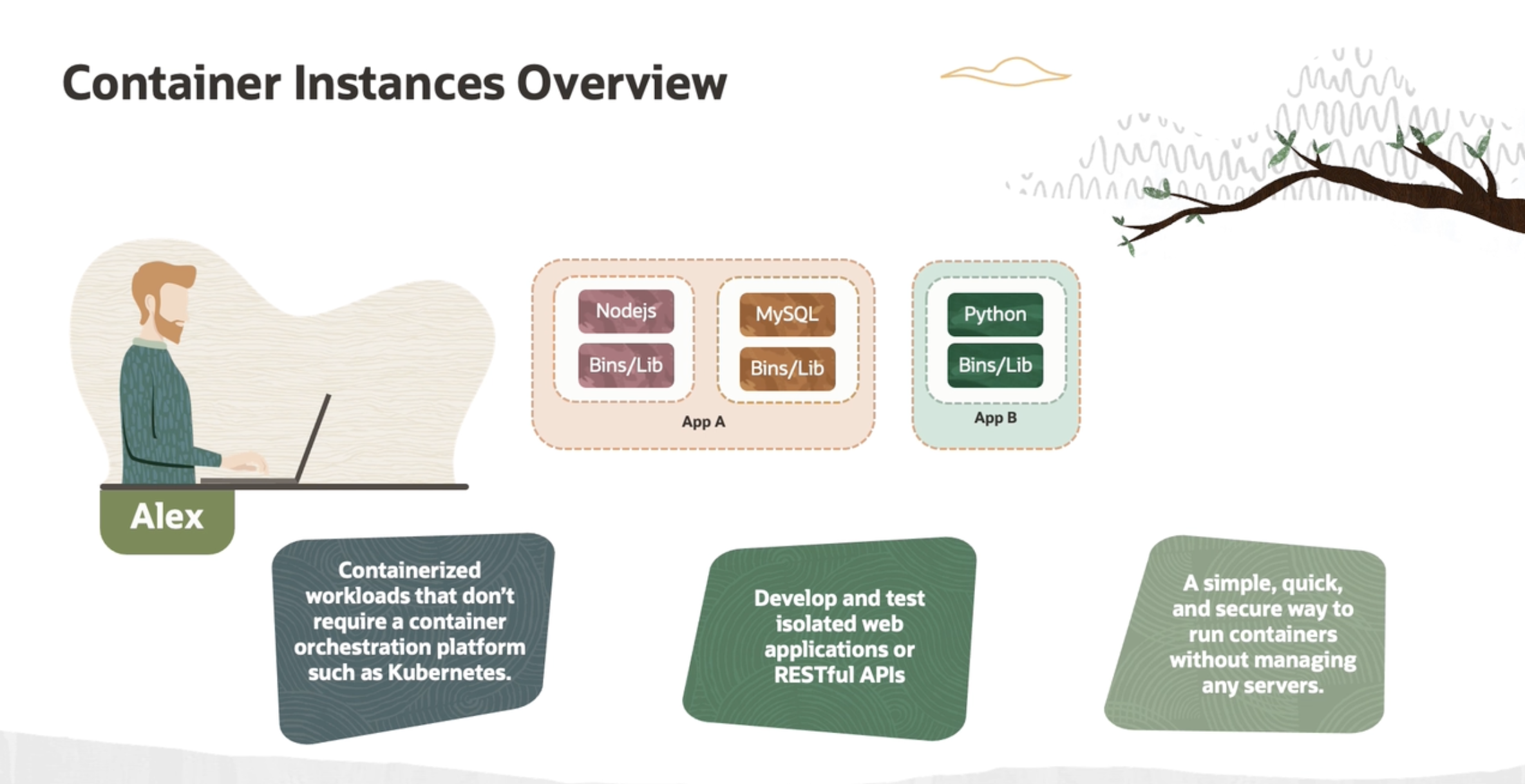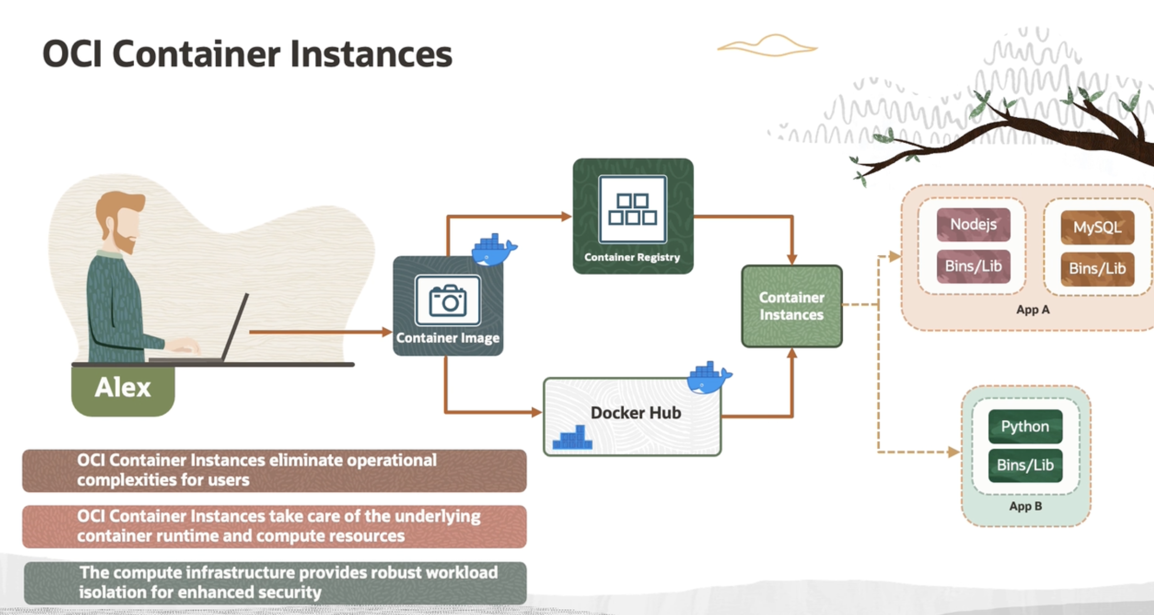 OCI Container Instances eliminates all the complexity of the traditional approach and allows you to run containers and applications in them without having to manage any infrastructure or servers. A container image is all that’s needed to run the application. The Oracle cloud manages the containerization server environment and computing resources. Containers run on fully managed computing resources optimized for workloads and provide reliable isolation for enhanced security. ref