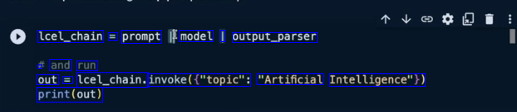 lcel_chain = prompt model I output_parser . and run out E lcel_chain. invoke(("topic": "Artificial Intelligence")) print(out)