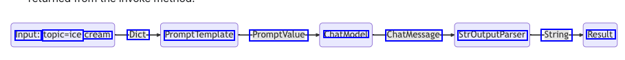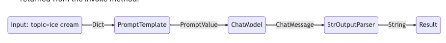 Input: topic-ice cream Dict- PromptTemplate PromptValue- ChatModel ChatMessage- StrOutputParser String- Result