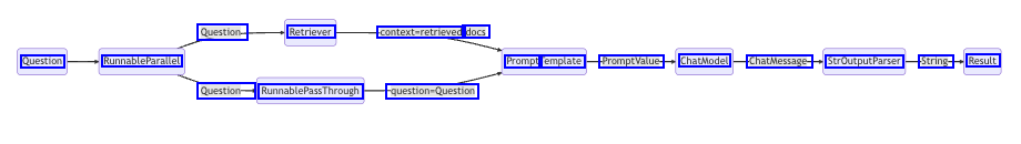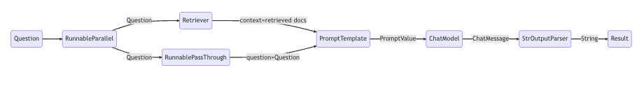 Question- Retriever context-retrieved docs Question RunnableParallel Prompt Template PromptValue- ChatModel ChatMessage- StrOutputParser String- Result Question- RunnablePassThrough question-Question