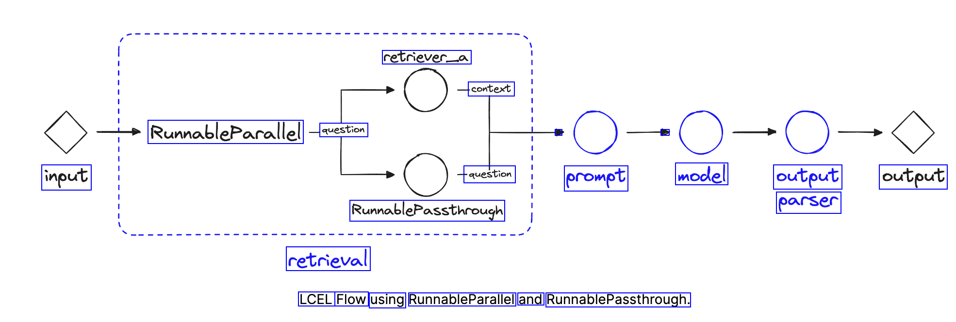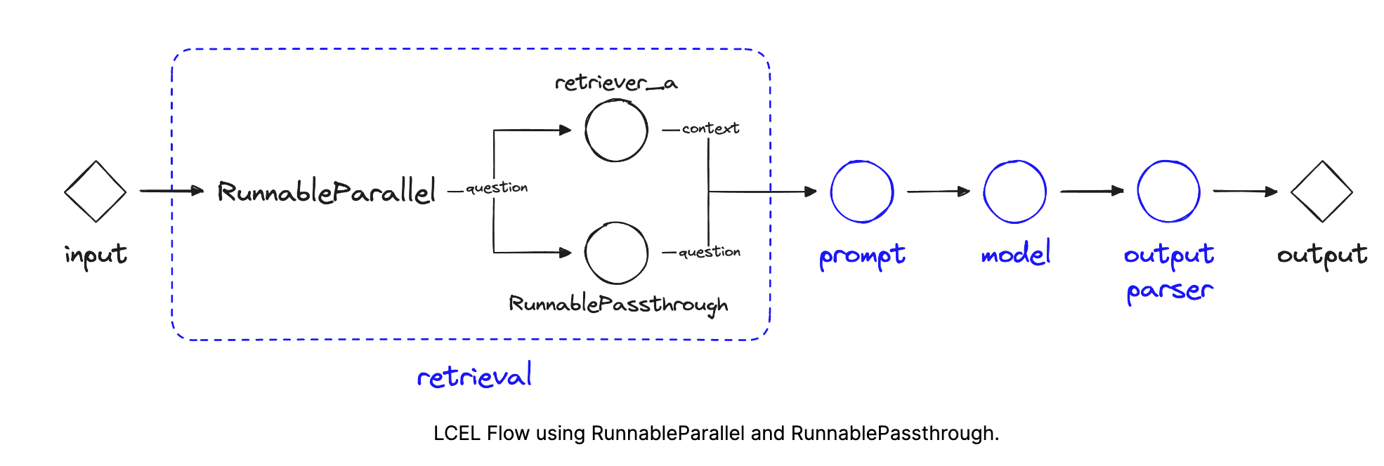 retriever_a context RumableParallel question - input question prompt model output output parser RumnablePassthrough retrieval LCEL Flow using RunnableParallel and RunnablePassthrough.