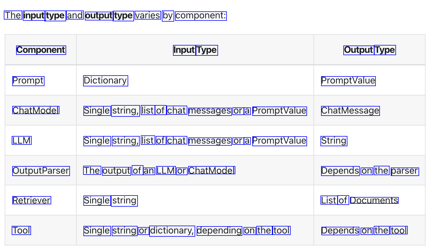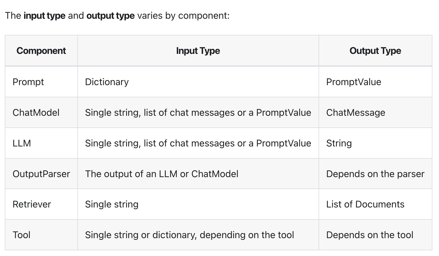 The input type and output type varies by component: Component Input Type Output Type Prompt Dictionary PromptValue ChatModel Single string, list of chat messages or a PromptValue ChatMessage LLM Single string, list of chat messages or a PromptValue String OutputParser The output of an LLM or ChatModel Depends on the parser Retriever Single string List of Documents Tool Single string or dictionary, depending on the tool Depends on the tool