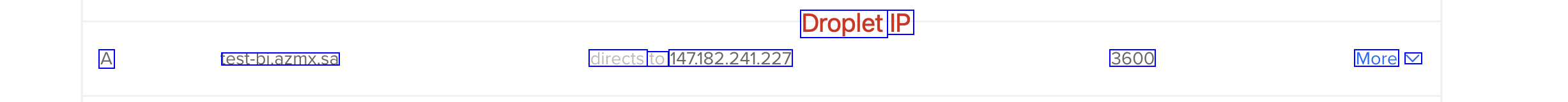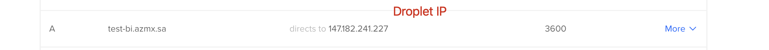 Droplet IP A test-bi.azmx.sa directs to 147182.241.227 3600 More V