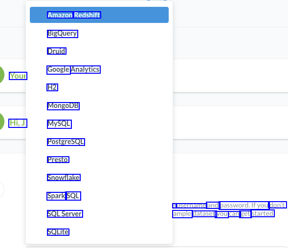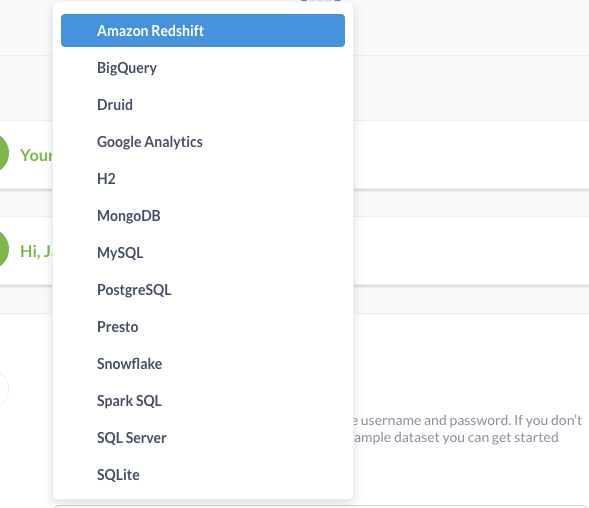 Amazon Redshift BigQuery Druid Google Analytics Your H2 MongoDB Hi,J. MySQL PostgreSQL Presto Snowflake Spark SQL e username and password.Ifyou don't ample dataset you can get started SQLServer SQLite