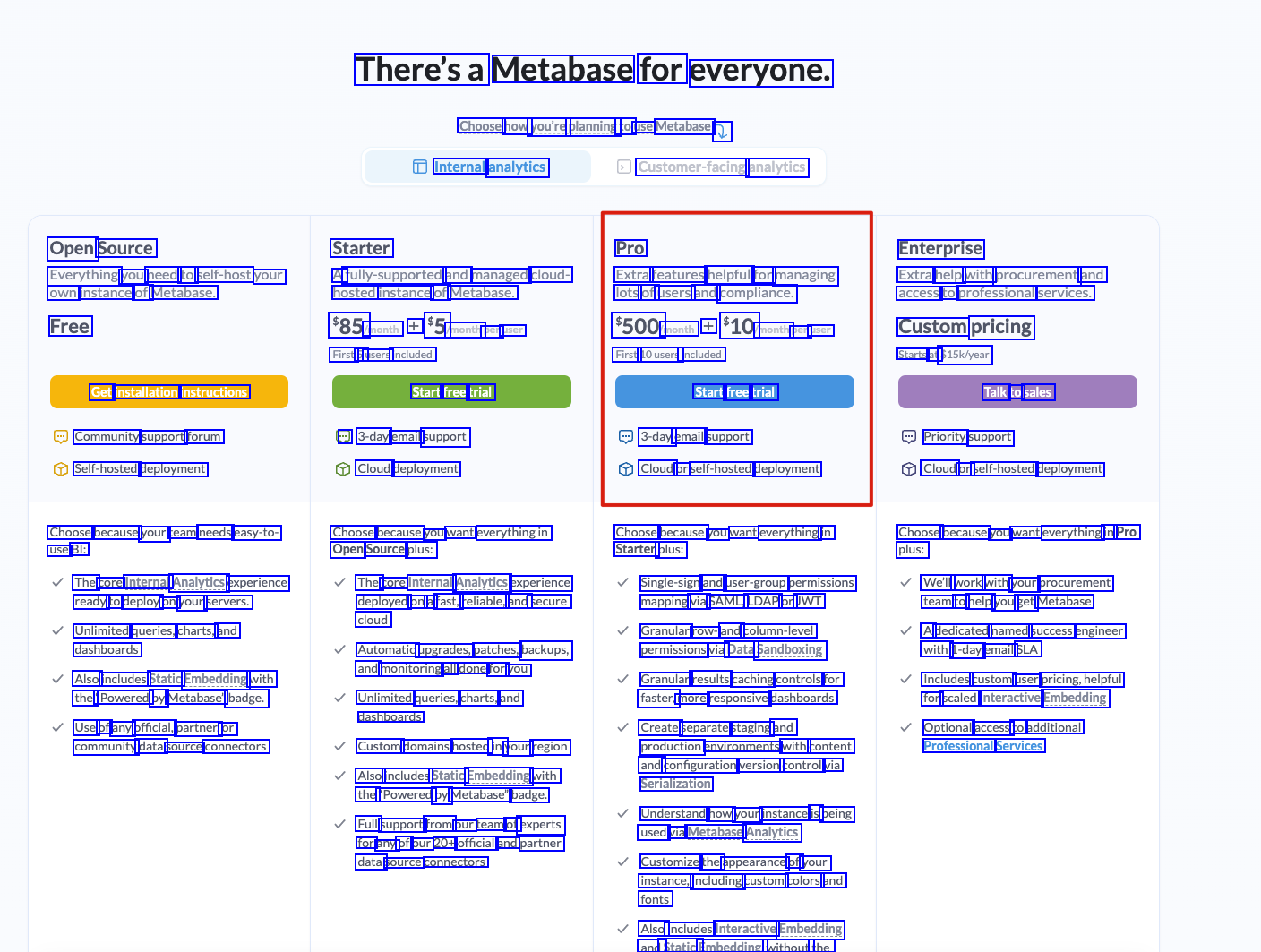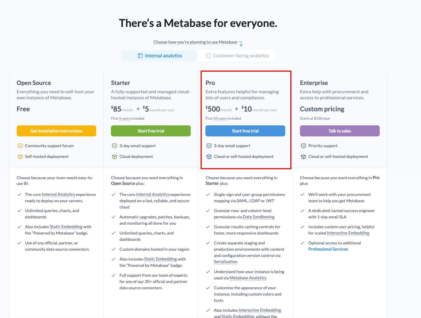 There'sa Metabase for everyone. Choose how you're planning to use Metabase 2 Internal analytics Customer-facing analytics Open Source Everything you need to self-host your own instance of Metabase. Free Starter Pro Enterprise Extra help with procurement and access to professional services. Custom pricing Starts at $15k/year A fully-supported and managed cloud- Extra features helpful for managing hosted instance of Metabase. $85 month + $5 month per user First 5u users included lots of users and compliance. $500 month + $10 month per user First 10usersi included Get installation instructions Community support forum Self-hosted deployment Start free trial Da 3-day email support Cloud deployment Start free trial 3-day email support Cloud or self-hosted deployment Talk to: sales Priority support Cloud or self-hosted deployment Choose because your team needs easy-to- The core Internal Analytics experience ready to deploy on your servers. Unlimited queries, charts, and dashboards Also includes Static Embedding with the "Powered by Metabase" badge. Use of any official, partner, or community data source connectors Choose because you want everythingin Open Source plus: The core Internal Analytics experience deployed on ai fast, reliable, and secure cloud Automatic upgrades, patches, backups, andi monitoring all done for you Unlimited queries, charts, and dashboards Custom domains hosted iny your region Also includes Static Embedding with the "Powered by Metabase" badge. Full support from our team of experts for any of our 20+ official and partner data source connectors Choose because you want everything in Starter plus: Single-sign and user-group permissions mapping via SAML, LDAP or JWT Granular row- and column-level permissions vial Data Sandboxing Granular results caching controls for faster, more responsive dashboards Create separate staging and production environments with content and configuration version control via Serialization Understand how your instance is being used via Metabase. Analytics Customize the appearance of your instance, including custom colors and fonts Also includes Interactive Embedding and Static Embedding, without the Choose because you want everything in Pro We'll work with your procurement teami tol help you get Metabase A dedicated named success engineer with: 1-day email SLA Includes custom user pricing,helpful for scaled Interactive Embedding Optional access to additional Professional Services use BI: plus: