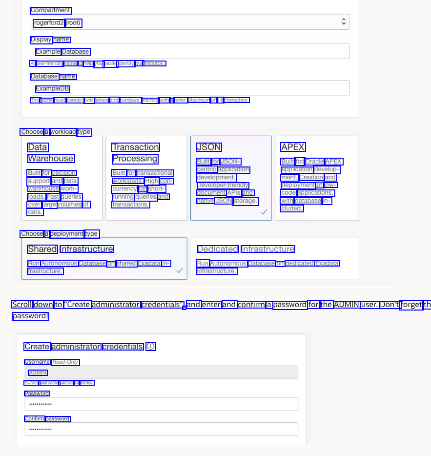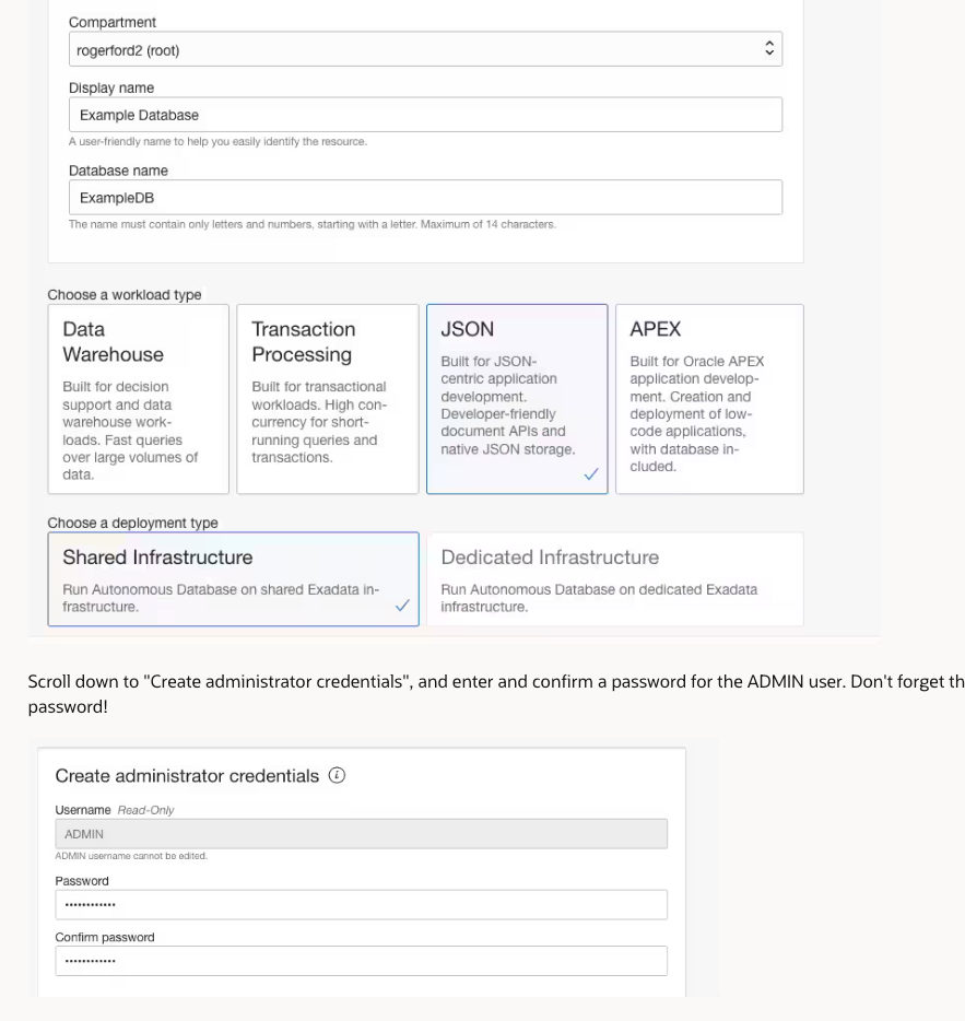 Compartment rogerford2 (root) Display name Example Database Database name ExampleDB A user-triendly name to help you easily identify the resource. The name must contain only letters and numbers, starting with a letter. Maximum of 14 characters. Choose a workload type Data Warehouse Built for decision support and data warehouse work- loads. Fast queries over large volumes of data. Transaction Processing Built for transactional workloads. High con- currency for short- running queries and transactions. JSON Built for JSON- centric application development. Developer-triendly document APIS and native JSON storage. APEX Built for Oracle APEX application develop- ment. Creation and deployment of low- code applications, with database in- cluded. Choose a deployment type Shared Infrastructure frastructure. Dedicated Infrastructure Run Autonomous Database on dedicated Exadata Run Autonomous Database on shared Exadata in- infrastructure. Scroll down to "Create administrator credentials", - and enter and confirm a password for the ADMIN user. Don't forget th password! Create administrator credentials @ Username Read-Only ADMIN ADMIN username cannot be edited. Password Confirm password
