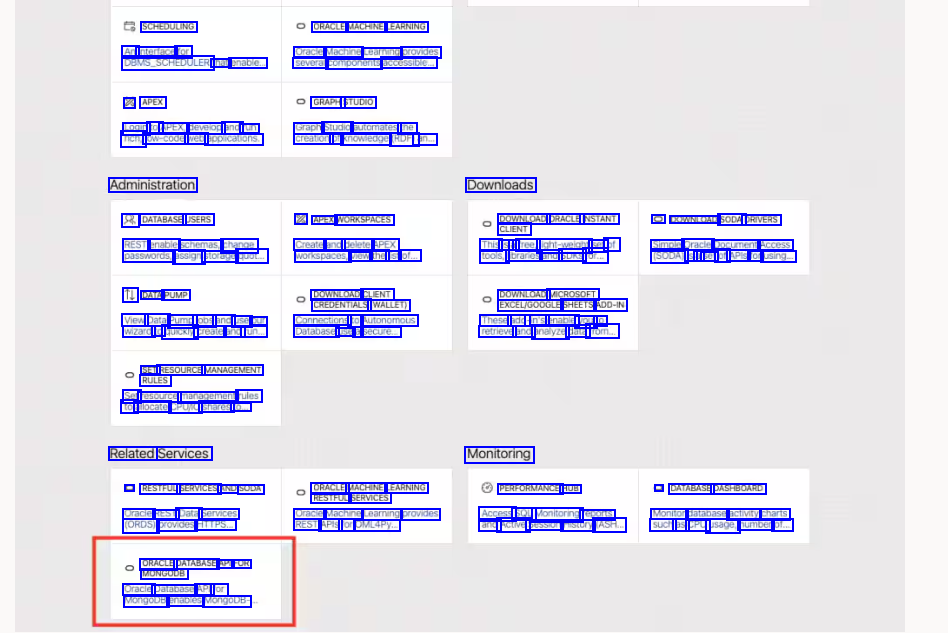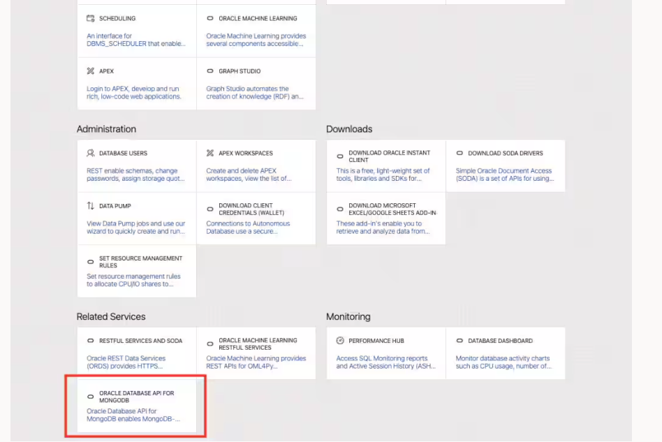 SCHEDULING Ani interface for ORACLE MACHINE LEARNING Oraclel Machine Learning provides DBVS_SCHEDULER that enable.. sevoral components accessible.. & APEX GRAPH STUDIO Graph Studio automates the creation of knowledge (RDF) an Login to APEX, develop and run rich, low-code web applications. Administration & DATABASE USERS REST enable schemas, change Downloads X APEX WORKSPACES Create and delete APEX DOWNLOAD ORACLE INSTANT CLIENT This isi at free, light-weight set of tools, libraries and SDKS for.. 0 DOWNLOAD SODA DRIVERS Simple Oracle Document Access (SODA) is a set of APIS for using- passwords, assign storage quot. workspaces, view the st of... TI DATA PUMP DOWNLOAD CLIENT CREDENTIALS (WALLET) DOWNLOAD MICROSOFT EXCEL/GOOGLE SHEETS ADD-IN These add- -in's enable: you to retrieve and analyze data from... View Data Pump jobs and use our Connections to Autonomous wizard to quickly create and run Database use a secure.- SET RESOURCEI MANAGEMENT RULES Set resource management rules to allocate CPUNO shares to. Related Services Monitoring - RESTFUL SERVICES. AND SODA Oracie REST Data Services (ORDS) provides HTTPS.- ORACLE MACHINE LEARNING RESTFUL SERVICES Oraciel Machine Leaming provides REST APIS for OML4Py.- PERFORMANCE HUB Access SQL Monitoring reports - DATABASE DASHBOARD Monitor database activity charts and Active: Session History (ASH.. such as CPU usage, number of.. ORACLE DATABASE API FOR MONGODB Oracle Database API for MongoDB enables MongoDB-