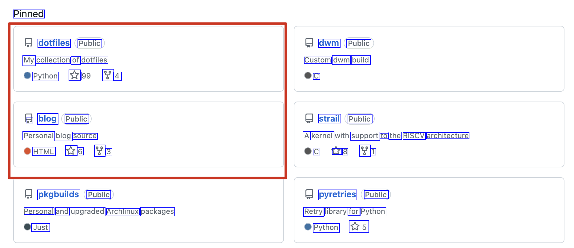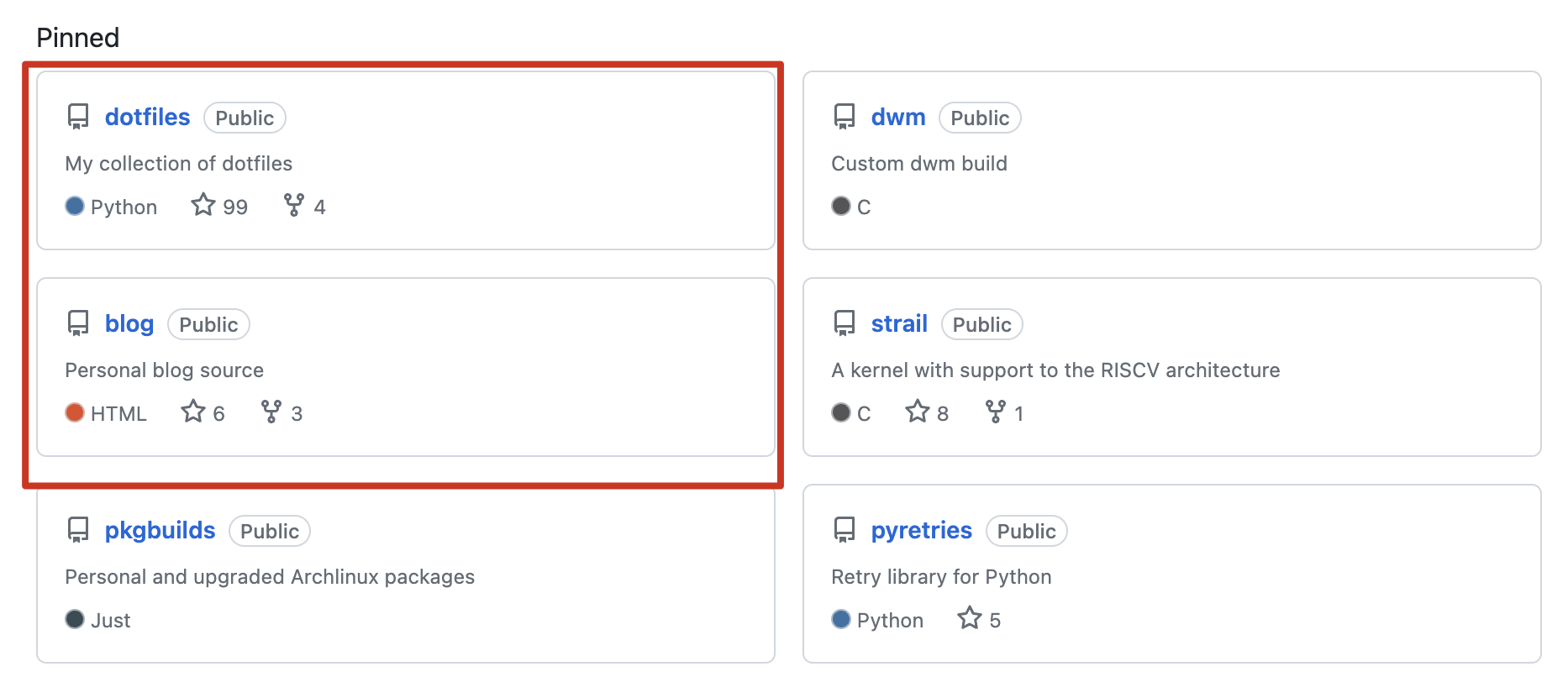 Pinned dotfiles Public dwm Public My collection of dotfiles Python L7 99 2 4 Custom dwm build C L blog Public strail Public Personal blog source A kernel with support to the RISCV architecture HTML 17 6 8 3 C 27 8 8 1 pkgbuilds Public pyretries Public Personal and upgraded Archlinux packages Retry library for Python Python 175 Just