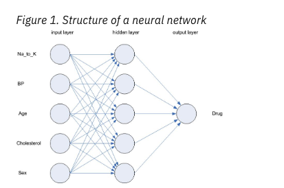 Figure 1. Structure of a neural network input layer hidden layer output layer Na_Wo_K BP Age Drug Cholesterol Sex
