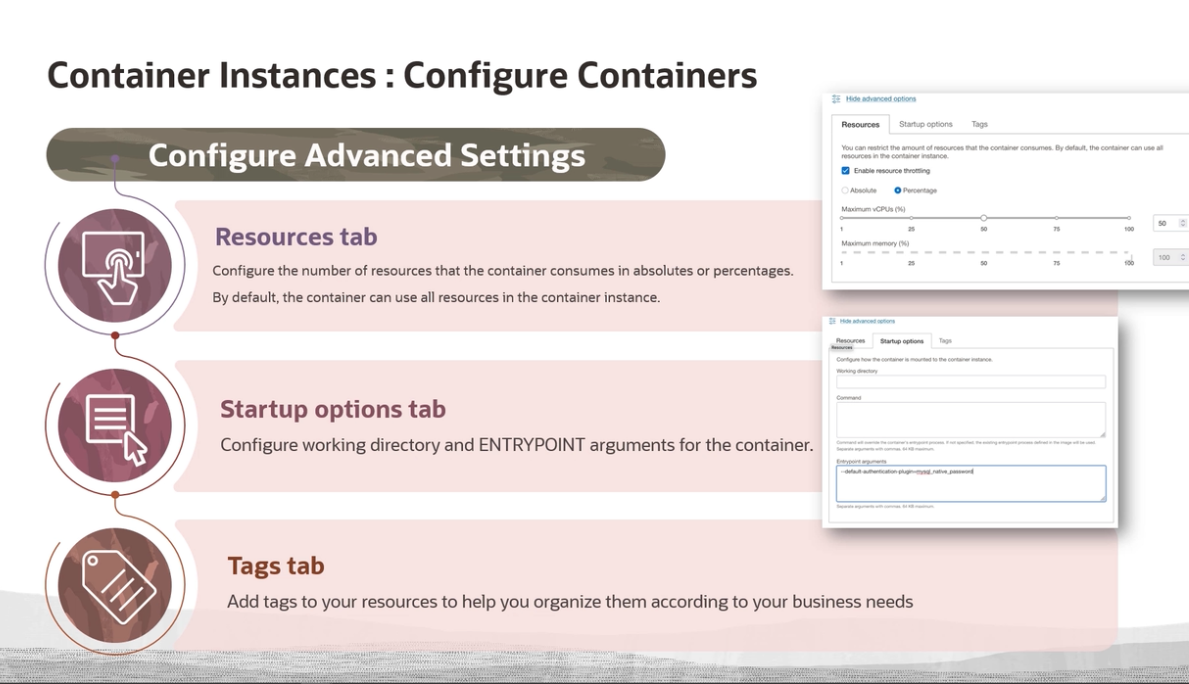 - Containers in a Container Instance have the same concept as a pod in Kubernetes with the main application container and supporting sidecar containers.