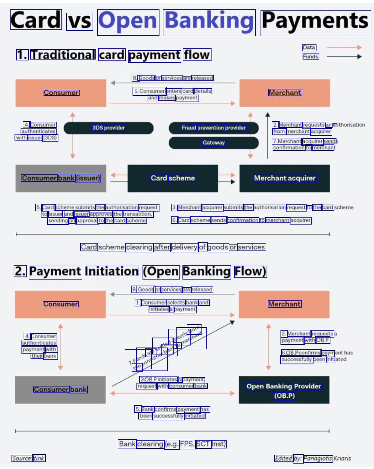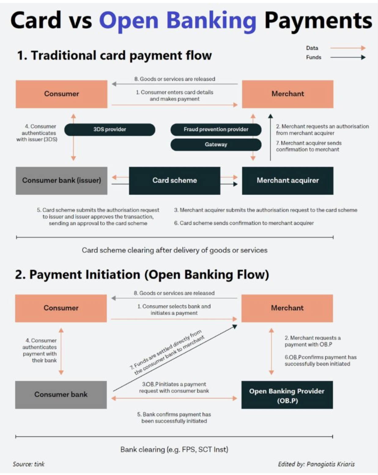 Demand for faster payments (because OB payments are nearly instant and settle faster than card transactions, giving merchants a clearer picture of their cash flow). The below graph from Tink brilliantly captures that showing the difference in the payment flow.