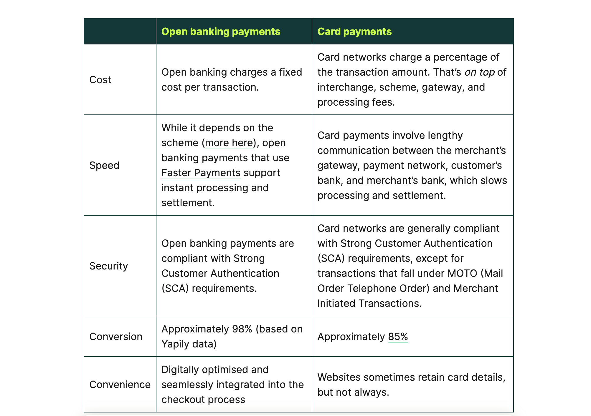 Open banking payments Card payments Card networks charge a percentage of Open banking charges a fixed the transaction amount. That's on top of Cost cost per transaction. interchange, scheme, gateway, and processing fees. While it depends on the scheme (more here), open banking payments that use Faster Payments support instant processing and settlement. Card payments involve lengthy communication between the merchant's gateway, payment network, customer's bank, and merchant's bank, which slows processing and settlement. Speed Card networks are generally compliant with Strong Customer Authentication (SCA) requirements, except for transactions that fall under MOTO (Mail Order Telephone Order) and Merchant Initiated Transactions. Open banking payments are compliant with Strong Customer Authentication (SCA) requirements. Security Approximately 98% (based on Conversion Approximately 85% Yapily data) Digitally optimised and Websites sometimes retain card details, Convenience seamlessly integrated into the but not always. checkout process