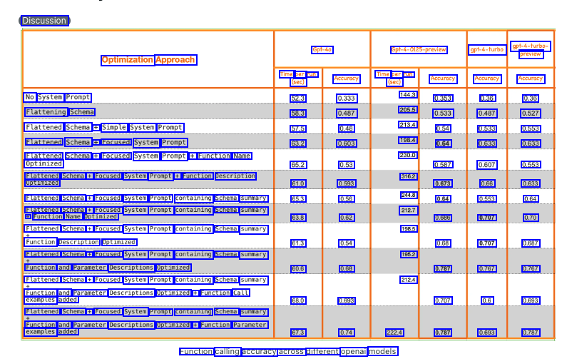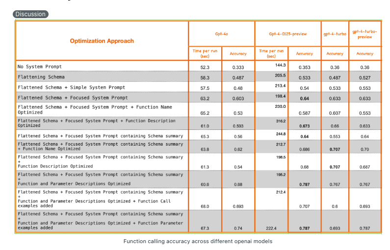 Discussion gpt-4-turbo- preview Gpt-40 Gpt-4-0125-preview gpt-4-turbo Optimization Approach Time per run (sec) 52.3 58.3 57.5 63.2 65.2 61.0 65.3 63.8 Time per run (sec) Accurecy 0.333 0.487 0.48 0.603 0.53 0.593 0.56 0.62 Accuracy Accuracy Accuracy No System Prompt Flattening Schema 144.3 0.353 205.5 0.533 213.4 0.54 198.4 0.64 230.0 0.587 316.2 0.673 244.8 0.64 212.7 0.686 198.5 0.36 0.487 0.533 0.633 0.607 0.66 0.553 0.707 0.36 0.527 0.553 0.633 0.553 0.633 0.64 0.70 Flattened Schema + Simple System Prompt Flattened Schema + Focused System Prompt Flattened Schema + Focused System Prompt + Function Name Flattened Schema + Focused System Prompt + Function Description Optimized Optimized Flattened Schema + Focused System Prompt containing Schema summary Flattened Schema + Focused System Prompt containing Schema summary Flattened Schema + Focused System Prompt containing Schema summary + Function Name Optimized Function Description Optimized 61.3 0.54 0.68 196.2 0.707 0.687 Flattened Schema + Focused System Prompt containing Schema summary Function and Parameter Descriptions Optimized 60.6 0.68 0.787 212.4 0.767 0.767 Flattened Schema + Focused System Prompt containing Schema summary Function and Parameter Descriptions Optimized + Function Call Flattened Schema + Focused System Prompt containing Schema summary Function and Parameter Descriptions Optimized + Function Parameter examples added 68.0 0.693 0.707 0.6 0.693 examples added 67.3 0.74 222.4 0.787 0.693 0.787 Function calling accuracy across different openai models