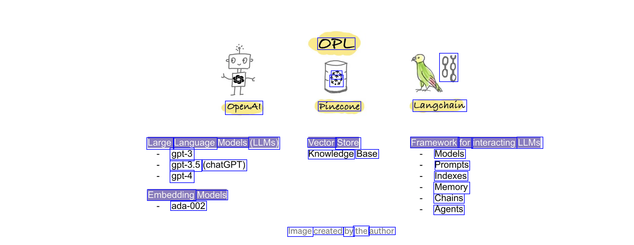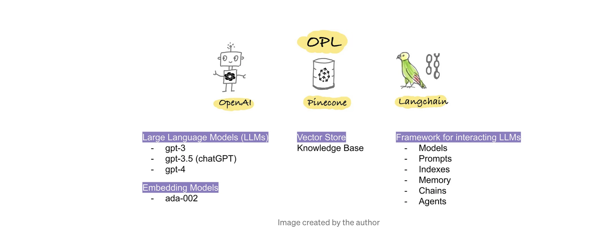 OPL FT €3 88 OpenAl Pinecone Langchain Large Language Models (LLMS) Vector Store Knowledge Base Framework for interacting LLMS gpt-3 Models Prompts Indexes Memory Chains Agents gpt-3.5 (chatGPT) gpt-4 Embedding Models ada-002 Image created by the author