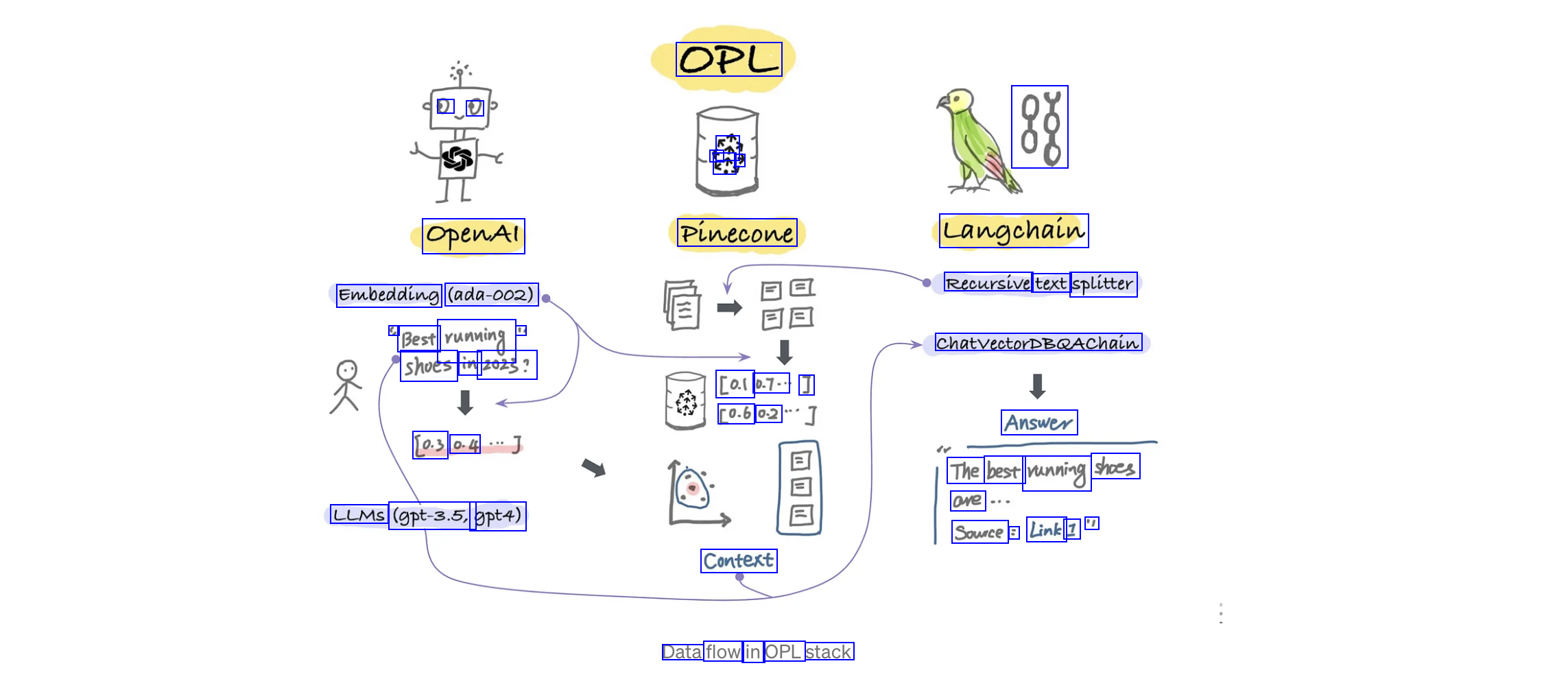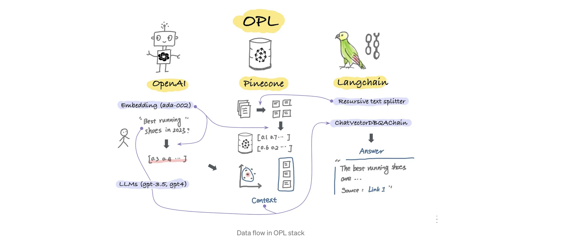 OPL ) U F. FT ? iT 88 OpenAl Pinecone Langchain Recursive text splitter Embedding (ada-002) 6 Best vunving t shoes in 2023? ChatvectorDBQAChain [o.t 0.7-. J [o.6 0-2 Answer lo.3 0-4 The best vunning shoes ove Sowce : Link 1 LLMS (gpt-3.5, opt4) 'I Context Data flow in OPL stack