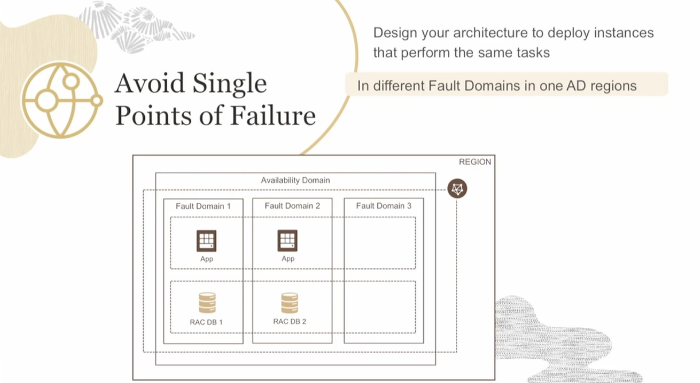 - Fault domains let you distribute your instances so that they are not on the same physical hardware within a single availability domain. A hardware failure or Compute hardware maintenance that affects one fault domain does not affect instances in other fault domains.