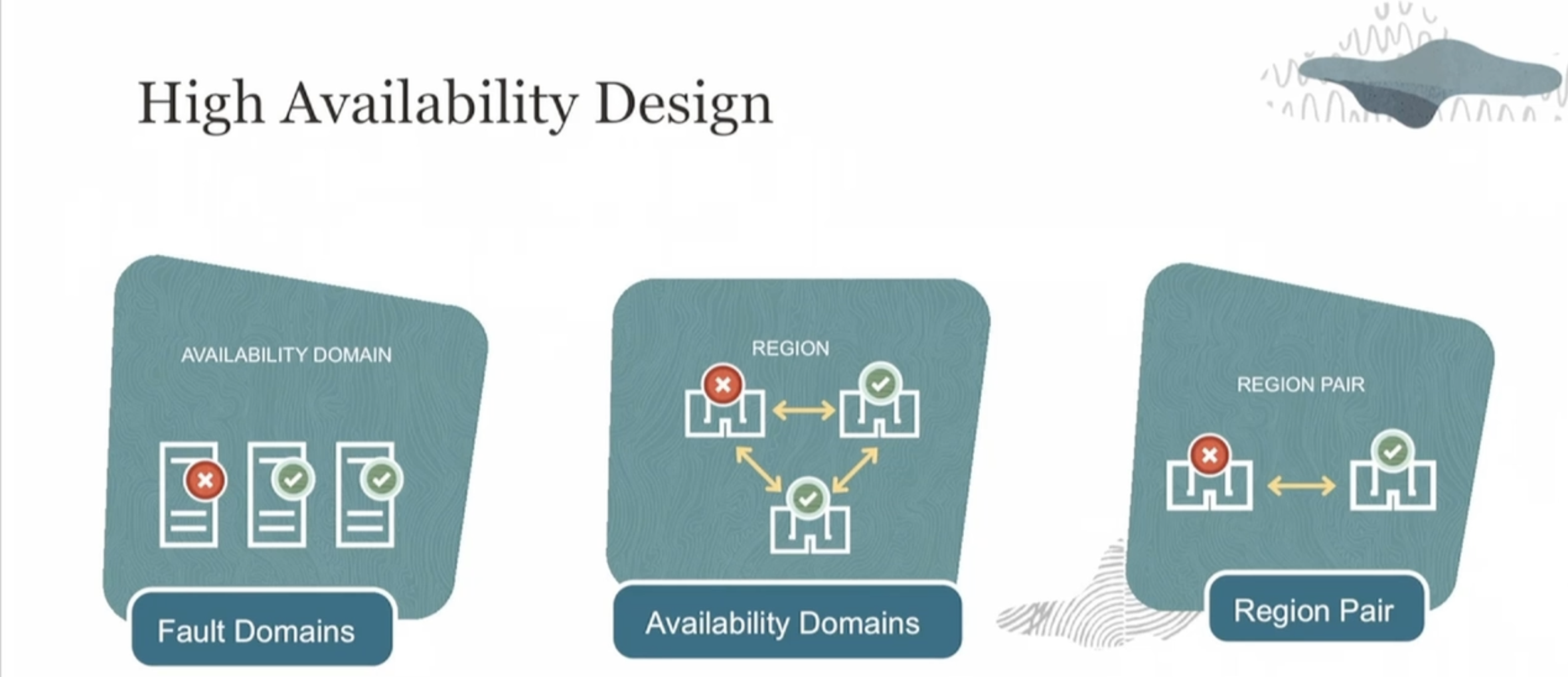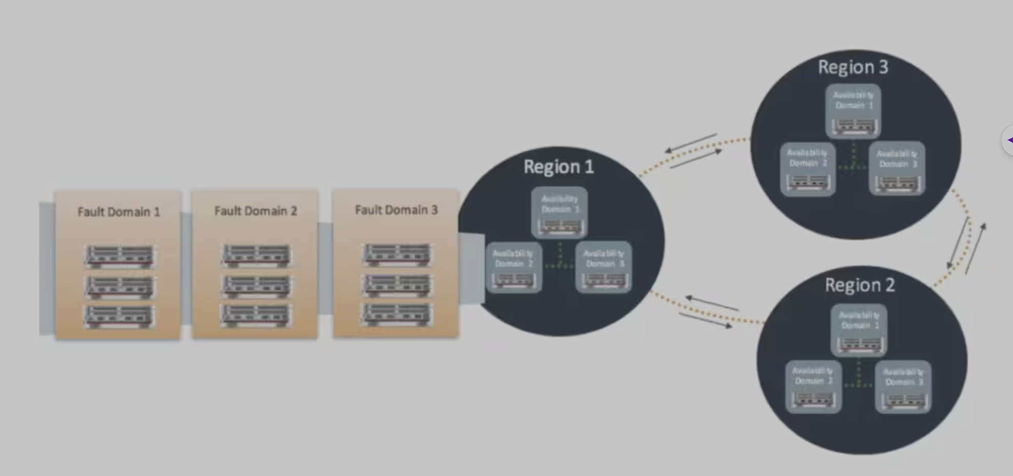 Region (Saudi) -> multiple Data Centers across different states 3 Fault Domain -> in each Availability Domain Multiple Availability Domain -> In each Region