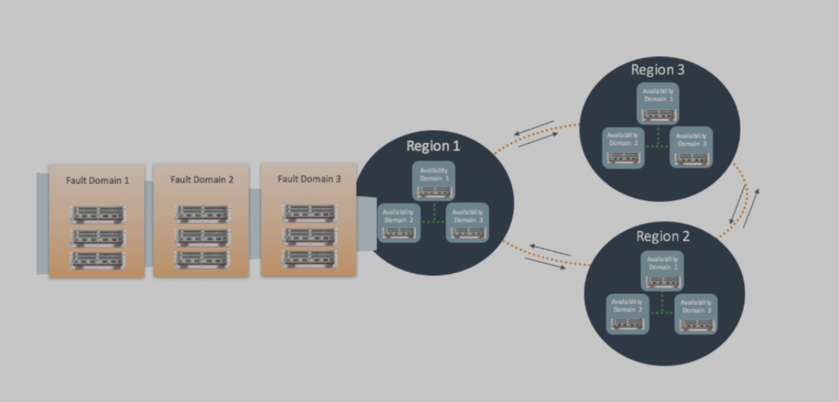 Region > Availability Domain (1 or more DC) > each AD contains 3 Fault Domain