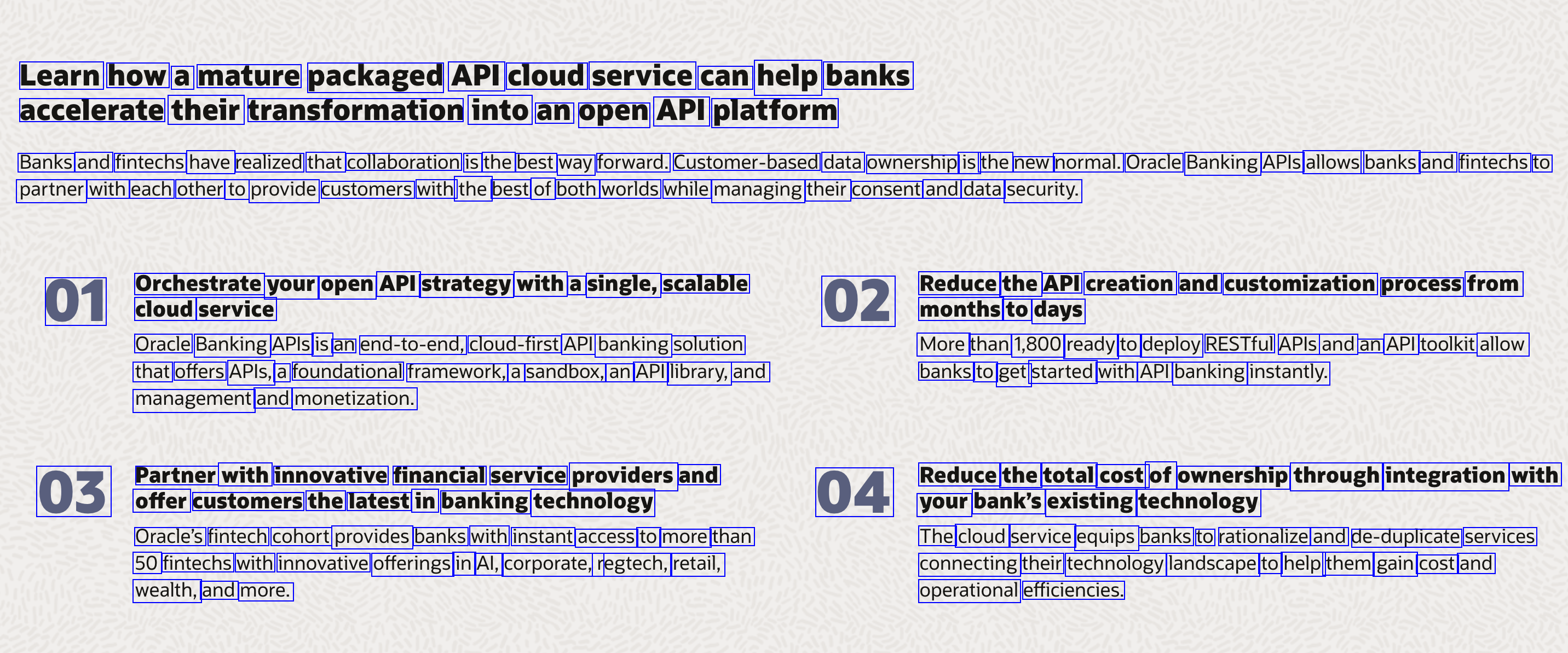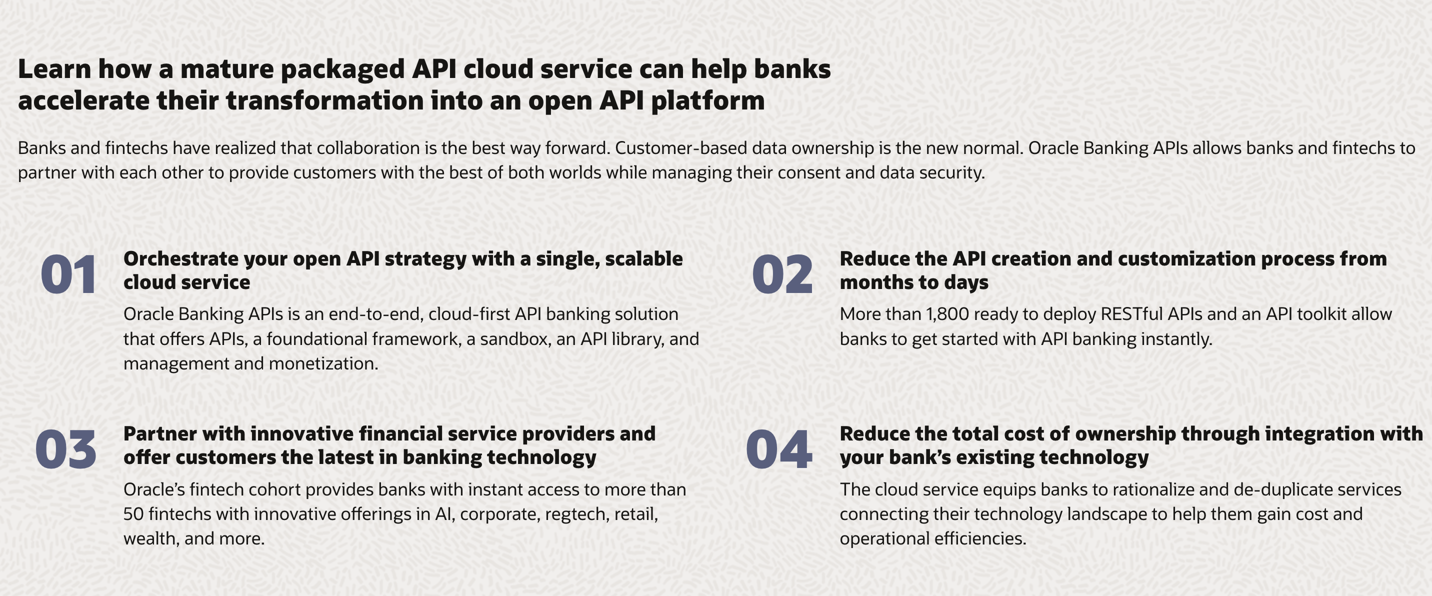Learn how a mature packaged API cloud service can help banks accelerate their transformation into an open API platform Banks and fintechs have realized that collaboration is the best way forward. Customer-based data ownership is the new normal. Oracle Banking APls allows banks and fintechs to partner with each other to provide customers with the best of both worlds while managing their consent and data security. Orchestrate your open API strategy with a single, scalable Reduce the API creation and customization process from 01 cloud service 02 months to days Oracle Banking APIs is an end-to-end, cloud-first API banking solution that offers APIs, a foundational framework, a sandbox, an API library, and More than 1,800 ready to deploy RESTful APIs and an API toolkit allow banks to get started with API banking instantly. management and monetization. Partner with innovative financial service providers and 03 offer customers the latest in banking technology Reduce the total cost of ownership through integration with 04 your bank's existing technology Oracle's fintech cohort provides banks with instant access to more than 50 fintechs with innovative offerings in Al, corporate, regtech, retail, The cloud service equips banks to rationalize and de-duplicate services connecting their technology landscape to help them gain cost and wealth, and more. operational efficiencies.