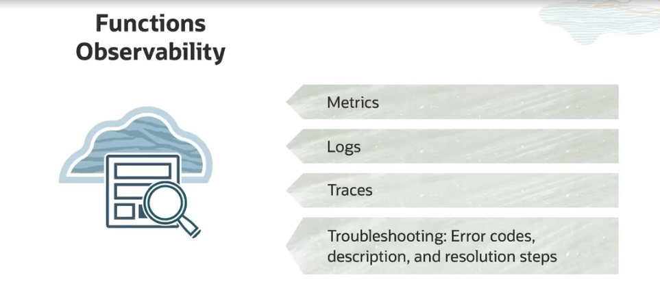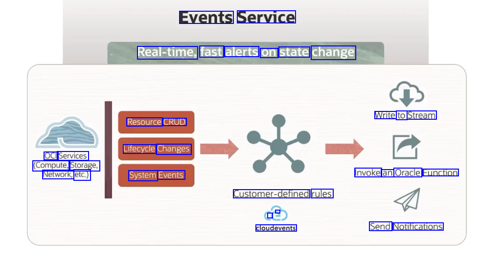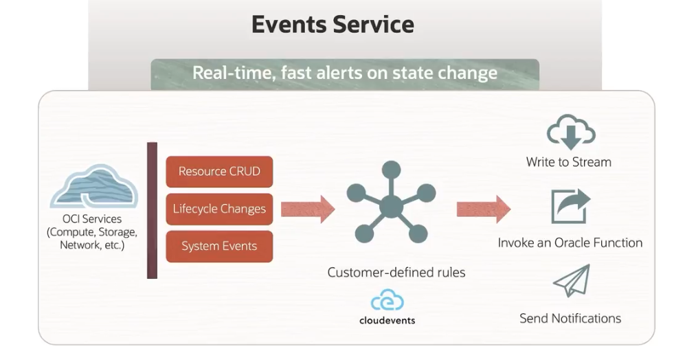Events Service Real-time, fast alerts on state change Write to Stream Resource CRUD Lifecycle Changes OCI Services (Compute, Storage, Network, etc.) System Events Invoke an Oracle Function Customer-defined rules I - cloudevents Send Notifications