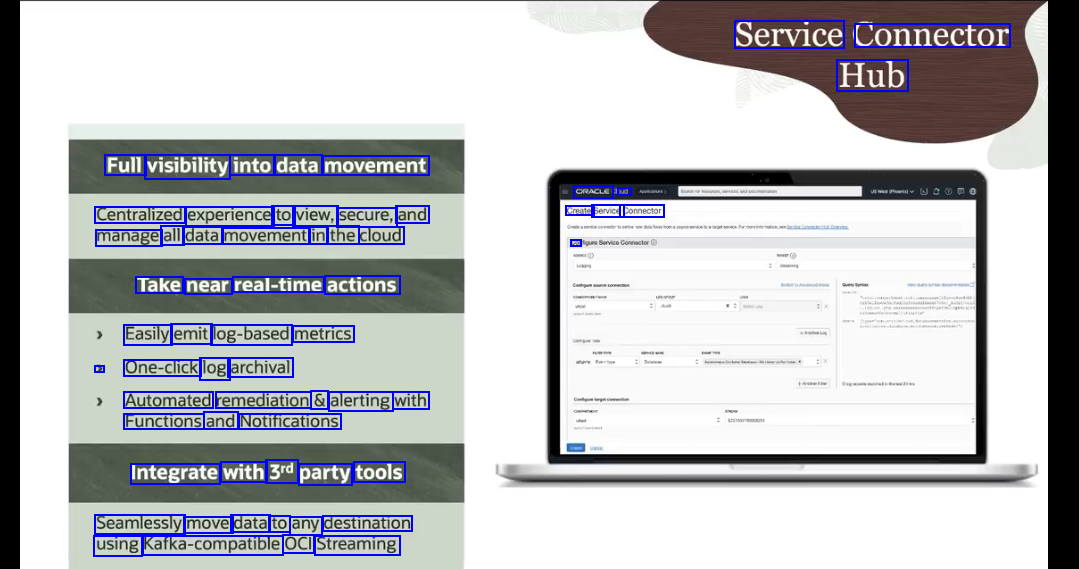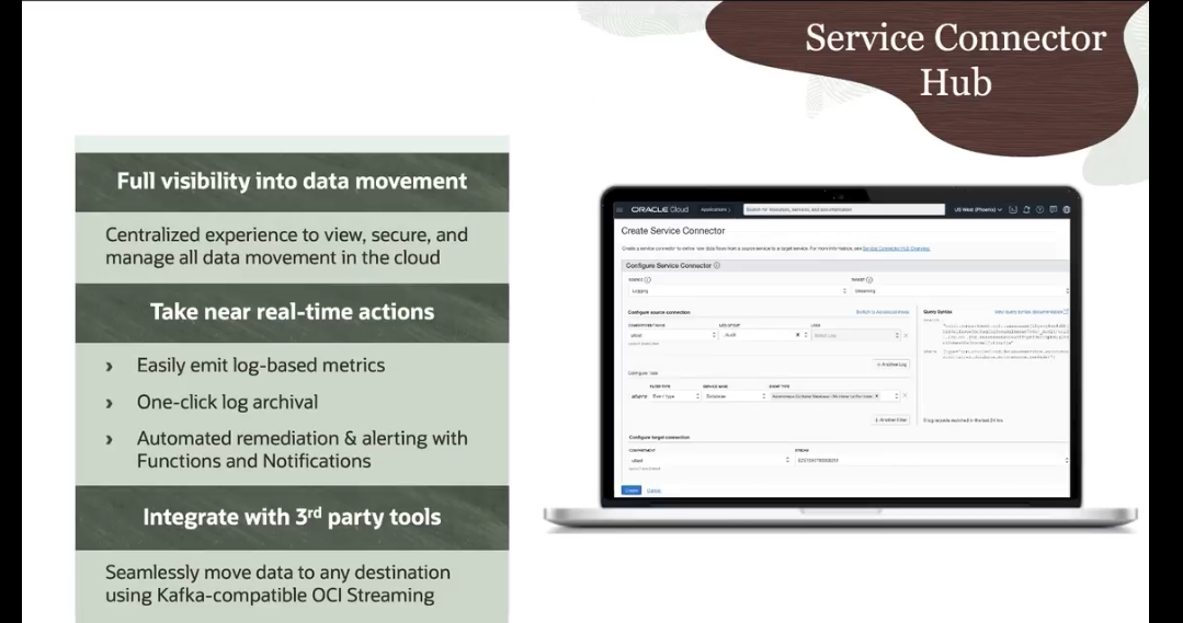 Service Connector Hub Full visibility into data movement ORACLE ud Create Service Connector dor Centralized experience to view, secure, and manage all data movement in the cloud Take near real-time actions Easily emit log-based metrics 2 One-click log archival Automated remediation & alerting with Functions and Notifications Integrate with 3rd party tools Seamlessly move data to any destination using Kafka-compatible OCI Streaming