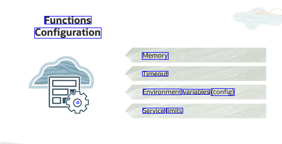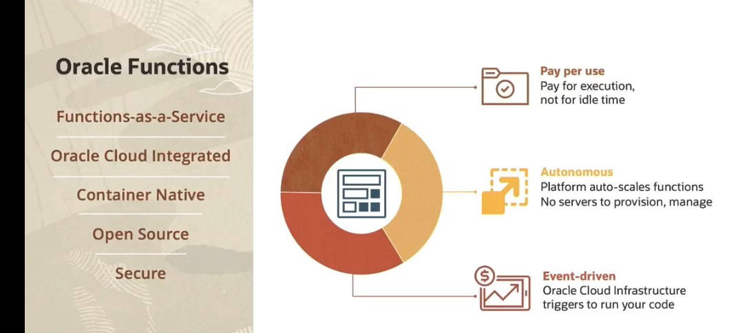Oracle Functions Pay per use Pay for execution, not for idle time Functions-as-as-a-Service Oracle Cloud Integrated Autonomous Platform auto-scales functions No servers to provision, manage Container Native Open Source Secure Event-driven Oracle Cloud Infrastructure triggers to run your code