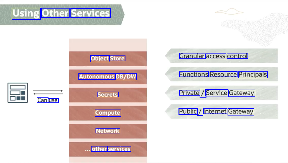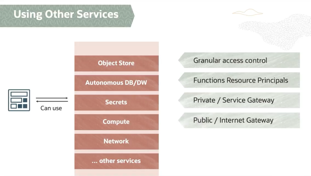 Using Other Services Object Store Granular access control Autonomous DB/DW Functions Resource Principals Secrets Private / Service Gateway Can use Compute Public / Internet Gateway Network other services