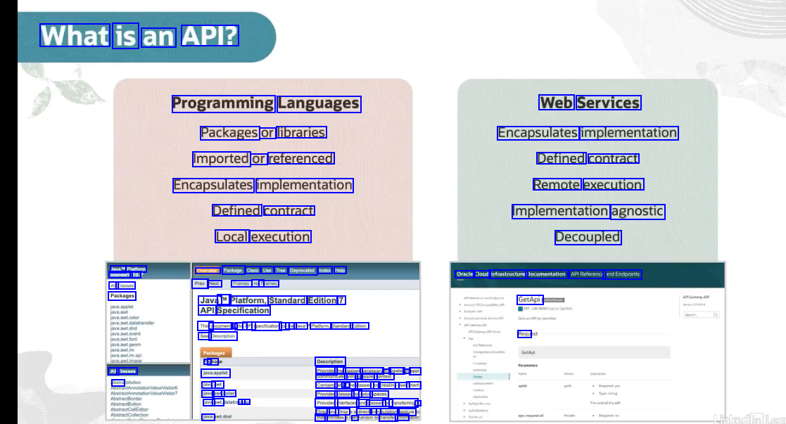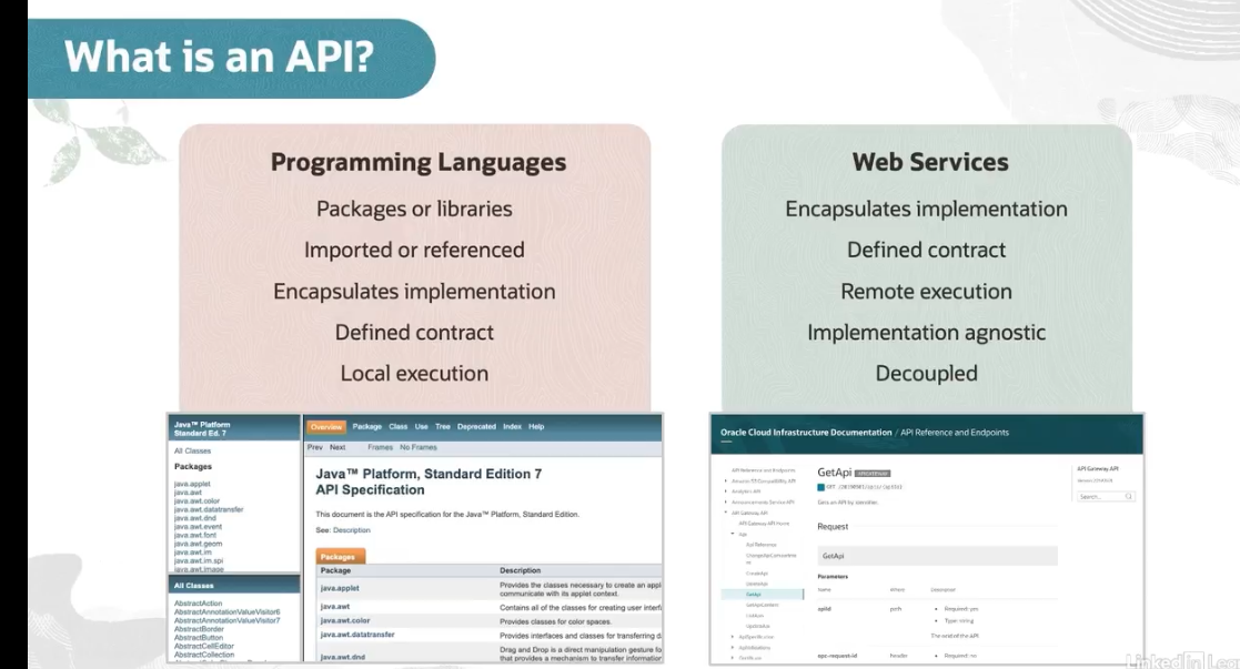 What is an API? Programming Languages Web Services Packages or libraries Imported or referenced Encapsulates implementation Defined contract Remote execution Encapsulates implementation Defined contract Local execution Implementation agnostic Decoupled Java" Platform Standard Ed. AI Classes Packages Overview Package Class Use Tree Deprecated Index Help Prev Next Frames NoF Frames Java TM Platform, Standard Edition 7 API Specification See: Descrption a cka javaapplet ava awt java awt color ava awt nat fer ava Oracle Cloud Infrastructure Decumentation APIReference andEndpoints GetApi Thisd document is the API speciication for the. Java' Platform, Standard Edtion. Requ Description Prevides te dasses necessary to vreate an appl communicate with a pplet context Contains al o the classes for creating user interfi Provides classes for color spaces Provides interlaces ande dasses for transferring d Drag and Drop direct nani pulation gesture Phat provides e ranster infom All Classes bstra