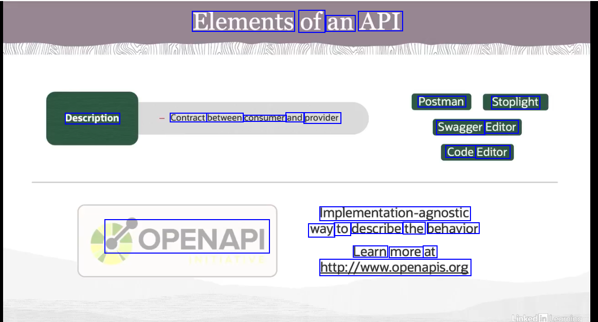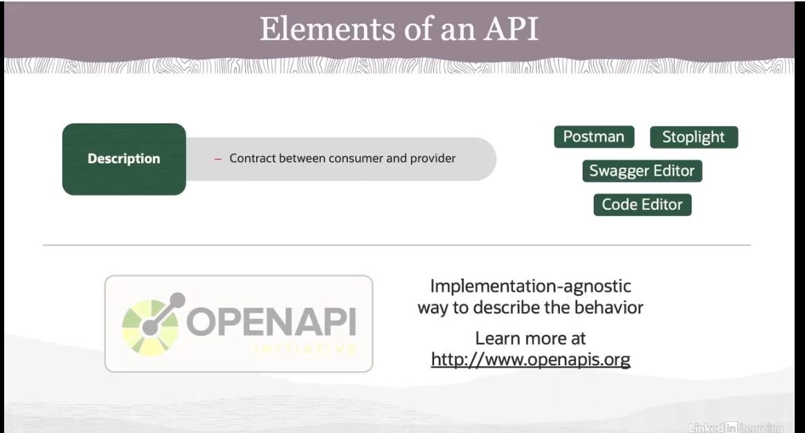 Elements of an API Postman Stoplight Description Contract between consumer and provider Swagger Editor Code Editor implementation-agnostic way to describe the behavior OPENAPI Learn more at htp/www.openapis.org