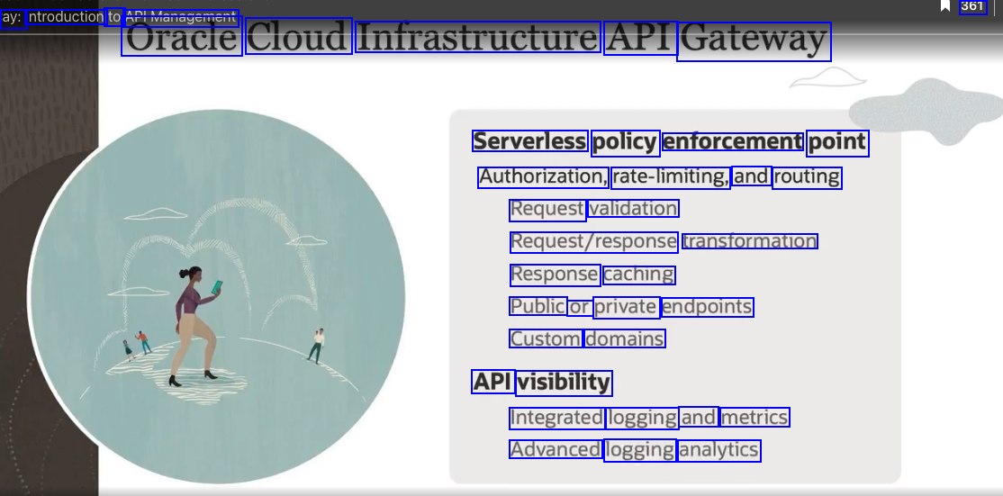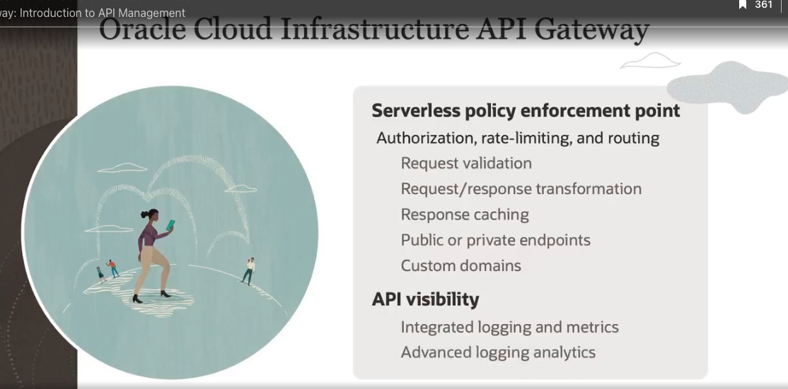 ay: Introduction to APIManagement 361 Oracie Cloud Infrastructure API Gateway Serverless policy enforcement point Authorization, rate-limiting, and routing Request validation Request/response transformation Response caching Public or private endpoints Custom domains API visibility Integrated logging and metrics Advanced logging analytics