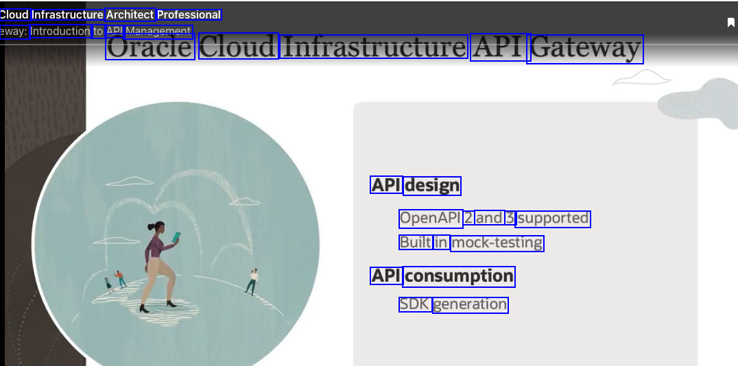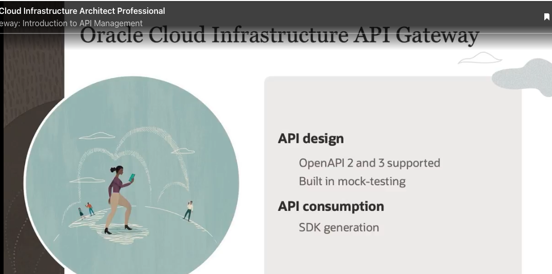 Cloud Infrastructure Architect Professional eway: Introduction to API Management Oracie Cloud infrastructure API Gateway API design OpenAPI 2 and 3 supported Built in mock-testing API consumption SDK generation