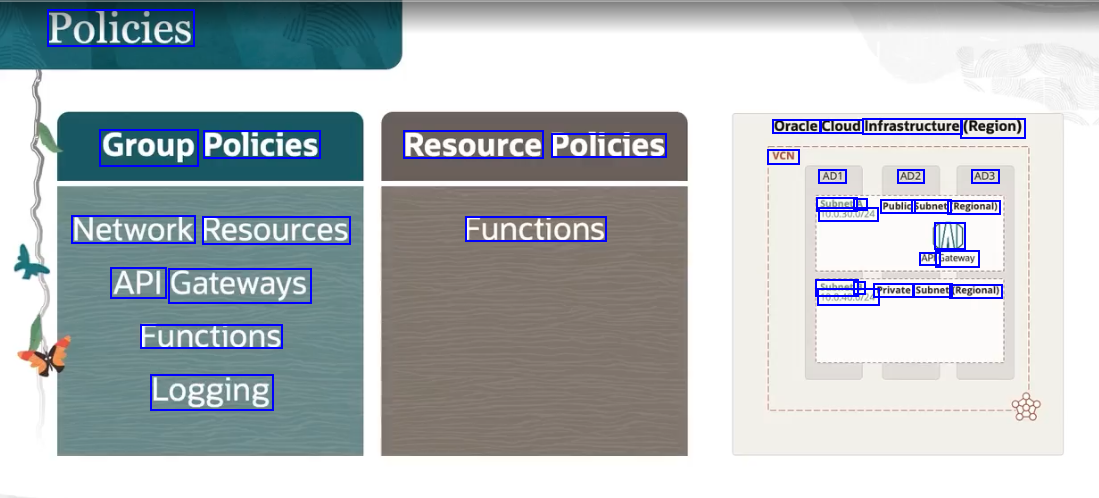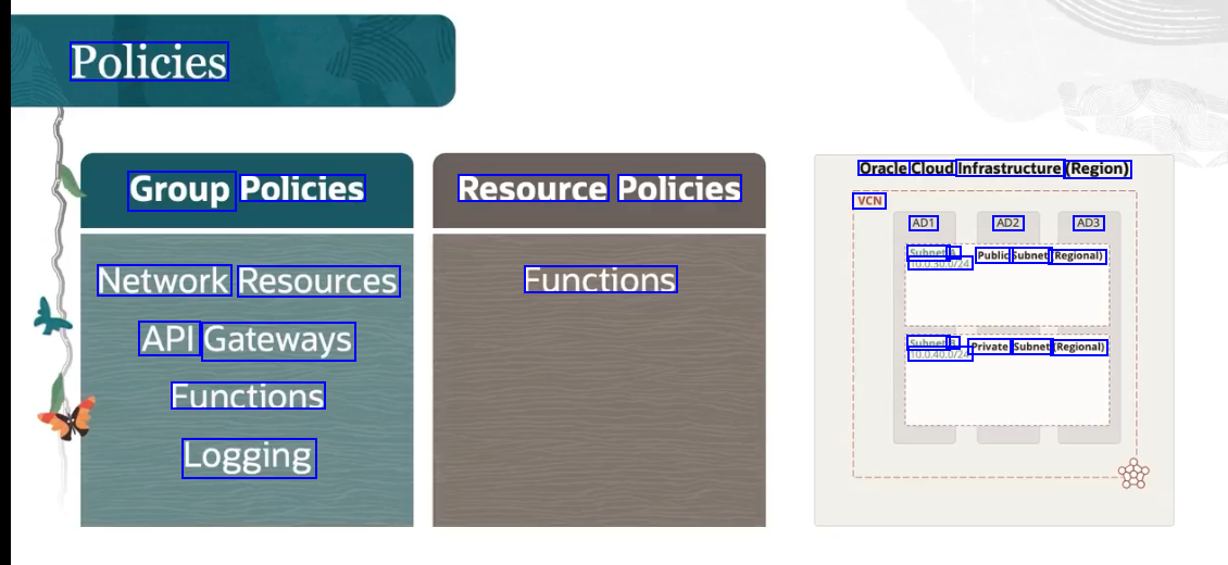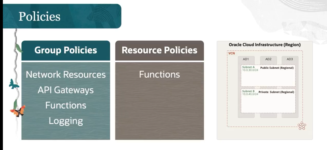 Policies Oracle Cloud Infrastructure (Region) Group Policies Resource Policies VCN AD1 AD2 AD3 Subnet A Public Subnet (Regional) 10.0.30.0/24 Network Resources Functions AD API Gateway API Gateways Subnet B Private Subnet (Regional) 10.0.40.0/24 Functions Logging