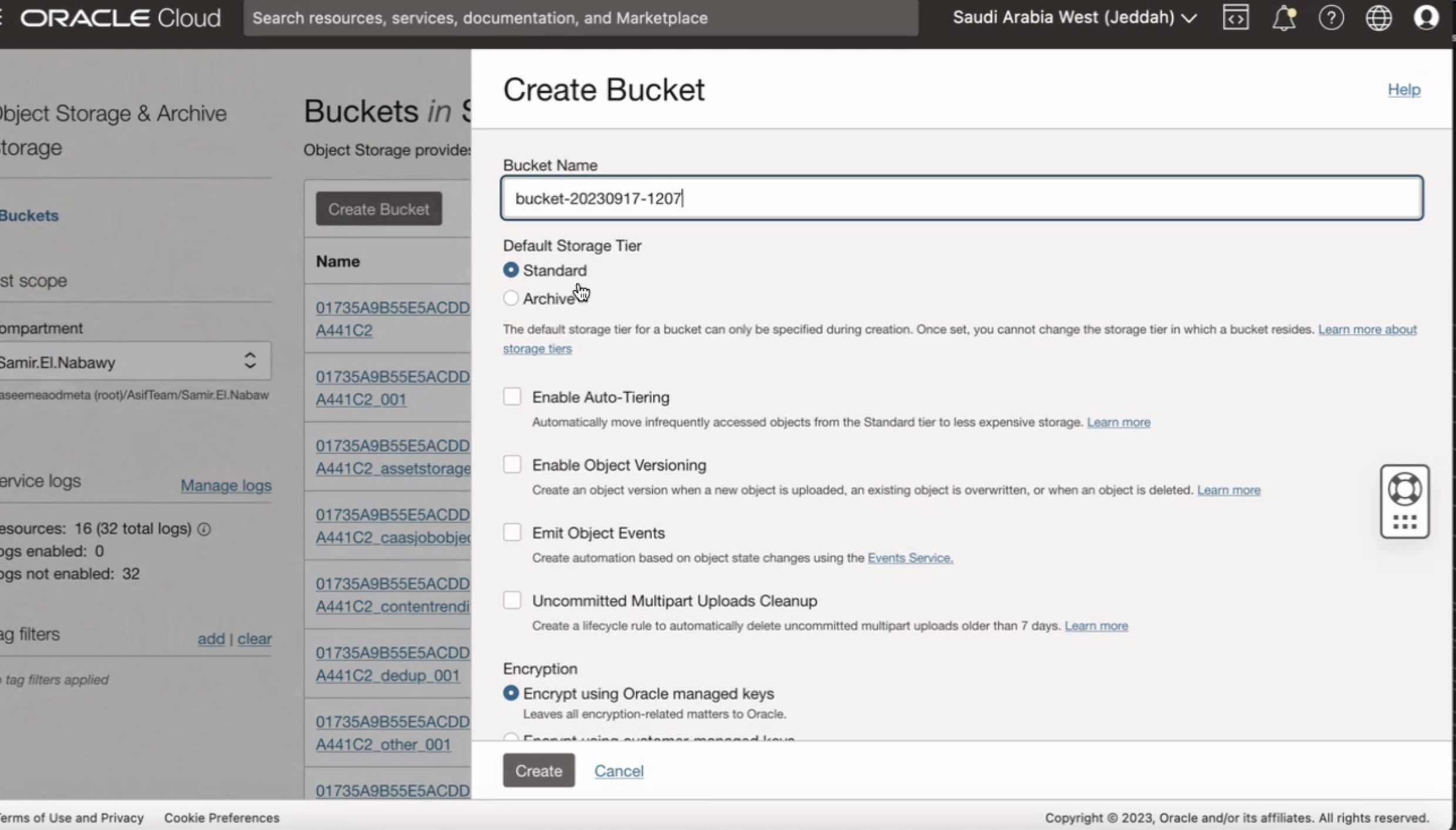 ORACLE Cloud Search resources, services, documentation, and Marketplace Saudi Arabia West (Jeddah) V Create Bucket Help bject Storage & Archive torage Buckets in S Object Storage provide: Bucket Name bucket-20230917-1207 Default Storage Tier Standard Archivel Buckets Create Bucket Name st scope ompartment Samir.El.Nabawy 01735A9B55E5ACDD A441C2 - The default storage tier for a bucket can only be specified during creation. Once set, you cannot change the storage tier in which a bucket resides. Learn more about storage tiers 01735A9B55E5ACDD seemeaodmeta (rooty/AsifTeam/Samir ELNabaw A441C2_001 Enable Auto-Tiering Automatically move infrequently accessed objects from the Standard tier to less expensive storage. Learn more 01735A9B55E5ACDD A441C2.assetstorage 01735A9B55E5ACDD A441C2 caasjobobjer 01735A9B55E5ACDD A441C2 contentrendi 01735A9B55E5ACDD A441C2 dedup 001 Encryption Enable Object Versioning ervice logs Manage logs Create an object version when a new object is uploaded, an existing object is overwritten, or when an object is deleted. Learnmore esources: 16 (32 total logs) 0 gs enabled: 0 gs not enabled: 32 Emit Events Object : Create automation based on object state changes using the Events Service. Uncommitted Multipart Uploads Cleanup Create a lifecycle rule to automatically delete uncommitted multipart uploads older than 7 days. Learnmore g filters tag filters applied add clear Encrypt using Oracle managed keys 01735A9B55E5ACDD Leaves all encryption-related matters to Oracle. A441C2 other_001 01735A9B55E5ACDD Create Cancel erms of Use and Privacy Cookie Preferences Copyright @ 2023, Oracle and/or its affiliates. All rights reserved.