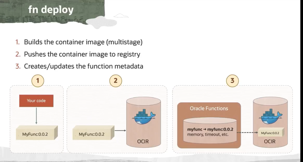 fn deploy 1. Builds the container image (multistage) 2. Pushes the container image to registry 3. Creates/updates the function metadata 1 L 2 3 Your code Oracle Functions myfunc myfunc:0.0.2 memory, timeout, etc. MyFunc:0.0.2 MyFunc:0.0.2 MyFunc:0.0.2 OCIR OCIR