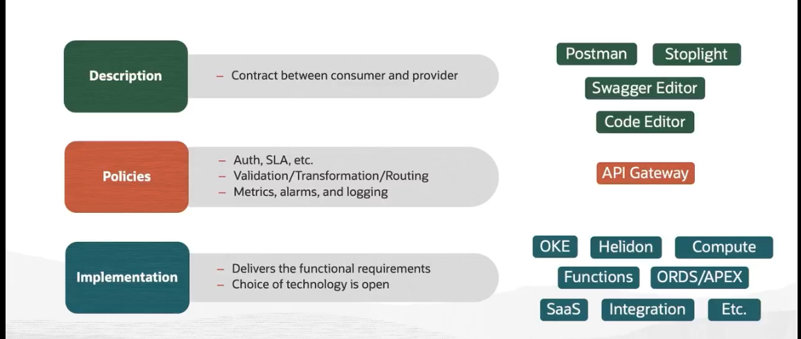 Postman Stoplight Description Contract between consumer and provider Swagger Editor Code Editor Auth, SLA, etc. Policies Validation/Transformation/Routing Metrics, alarms, and logging API Gateway OKE Helidon Compute Delivers the functional requirements Choice of technology is open Implementation Functions ORDS/APEX Saas Integration Etc.