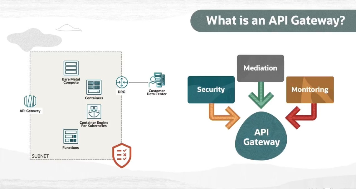 What is an API Gateway? Mediation Bare Metal Compute m m e mm - DRG Containers - Customer Data Center Security Monitoring 1AN API Gateway Container For cainerErgine API Gateway Functions SUBNET