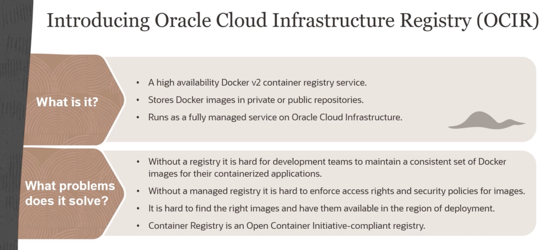 Introducing Oracle Cloud Infrastructure Registry (OCIR) A high availability Docker v2 container registry service. What is it? Stores Docker images in private or public repositories. Runs as a fully managed service on Oracle Cloud Infrastructure. Without a registryit is hard for development teams to maintain a consistent set of Docker images for their containerized applications. What problems does it solve? Without a managed registry it is hard to enforce access rights and security policies for images. Itis hard to find the right images and have them available in the region of deployment. Container Registry is an Open Container Initiative-compliant registry.