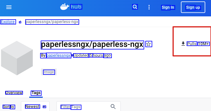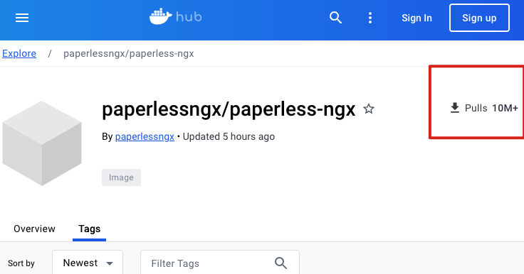 hub Q Sign In Sign up Explore I paperlessngy/papelessengs paperlessngy/papelessngs 17 Pulls 10M+ By paperlessngx - Updated 5 hours ago Image Overview Tags Sort by Newest - Filter Tags